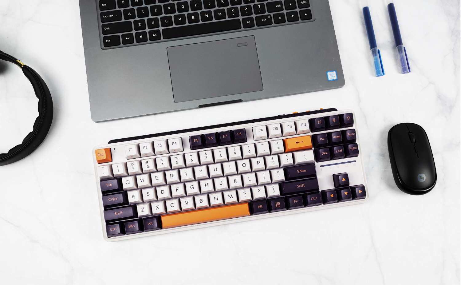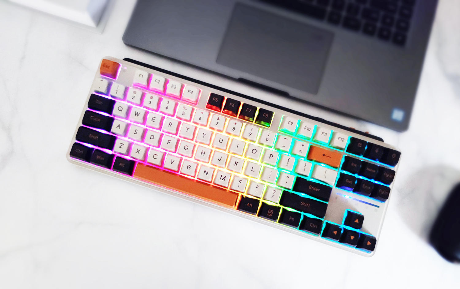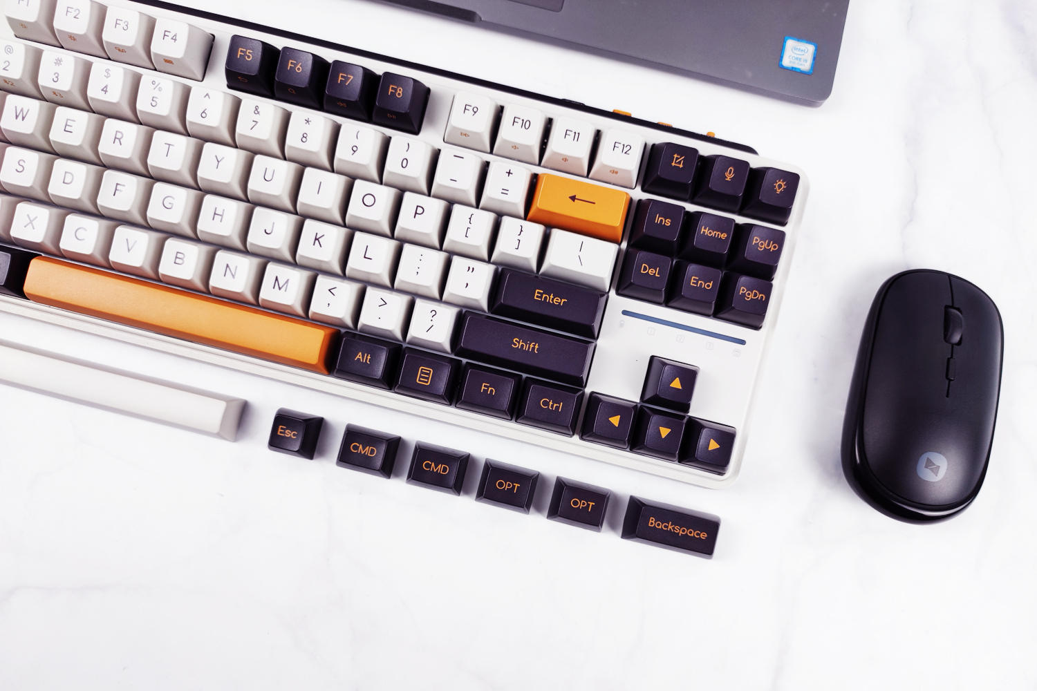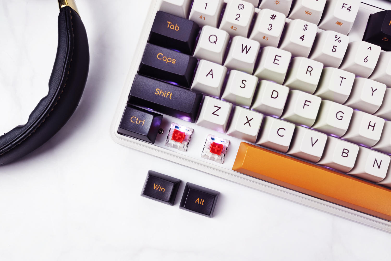 键盘有冬之旷野(佳达隆G黄PRO轴)、紫薯牛奶(凯华B0X红轴)两种可选,我这款是紫薯牛奶配色,主色调为白色+暗紫色+橙色,复古风造型、力量感十足,外观符合我的审美。