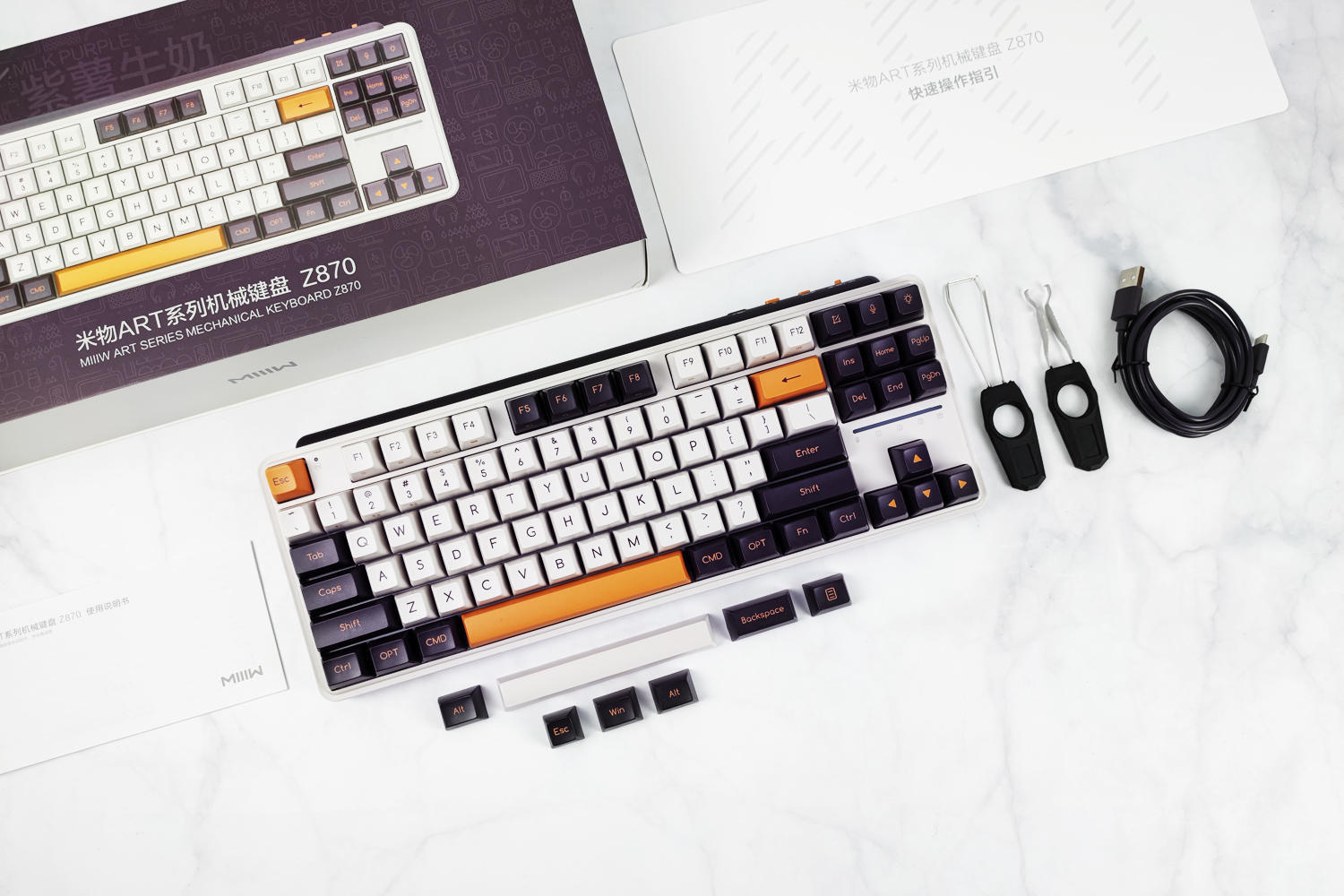 老规矩,先开箱!米物ART系列机械键盘 Z870采用的是简约风格,外盒正面是键盘实物图展示,背面是特点展示。取出全套配件,有键盘(含防尘罩)、2.4G接收器、拔键器、拔轴器、Type-C连接线、快速指南与说明书、以及Windows键区的替换键帽(含Win键、Alt键、空格键等共计七颗键帽)。