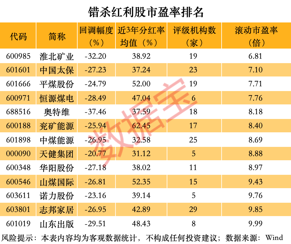 事实上,很多煤炭股或许被错杀。据数据宝统计,5家以上机构评级、滚动股息率在3%以上、滚动市盈率低于10倍的个股中,有13只股票过去3年加权净资产收益率均超10%、分红率均超30%且最新价较去年四季度以来高点回调超20%。其中,多只煤炭股上榜,包括平煤股份、华阳股份、兖矿能源、恒源煤电、淮北矿业、中煤能源、山煤国际等。