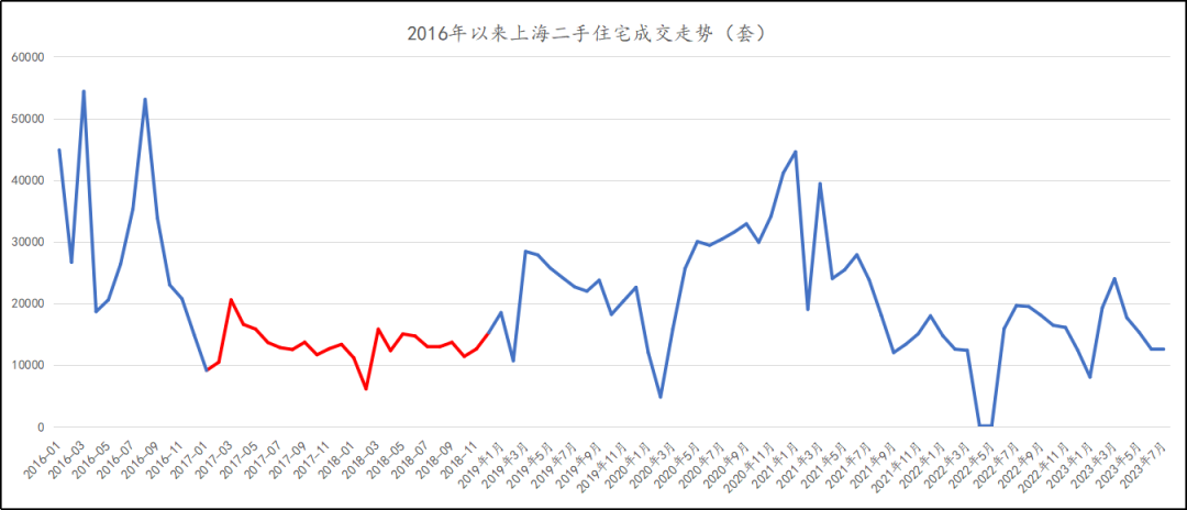 2017年开始的数据各位可以锁定下,从2017年开始到2018年,整整24个月,上海每月二手住宅成交都在1.2万套上下浮动