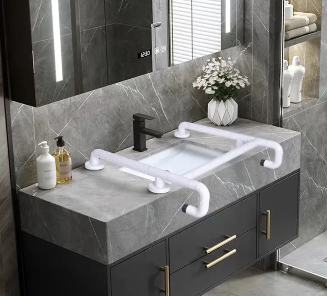 第二个位置则是在洗脸台,因为有时候洗脸台下面也会湿漉漉的容易滑倒,可以在台盆上安装扶手