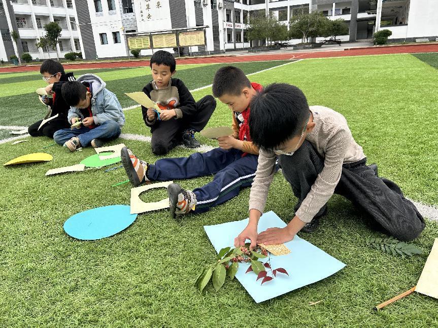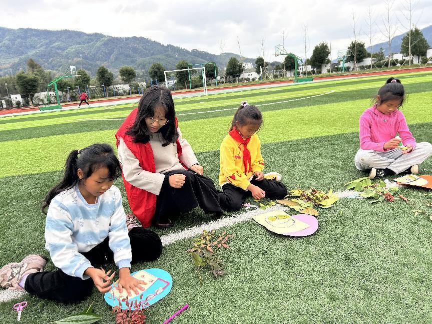 孩子们围坐草地上,仰望天空,开始了对世界的探索。秋天本是一个收获的季节,有着丰收的喜悦,宜收集美好!在这季节里,落叶也成了呈坎灵山秋天最美丽的风景,一片片斑斓的叶子被秋风吹落,停歇在树下、草丛、路边……给大地增添了色彩。都说一叶知秋,孩子们眼里的秋天会是怎样的呢?带着这个疑问,志愿者们带领孩子们探索灵山秋日的奥秘与神奇,捡拾落叶DIY具有秋天特色的花篮。孩子们尽情打开自己的脑洞,充分发挥创造力,用拾捡的银杏叶、枫叶、槐树叶等落叶,通过画一画、剪一剪、贴一贴等多种制作手法,将各种物品巧妙地组合在一起,制作出自己心中的秋天。随着一片一片落叶被小心翼翼的插入花篮里,志愿者们也参与其中,和孩子们一起动手将落叶穿插得更有层次感。经过努力,一幅幅丰富有趣的手工创意作品呈现在大家面前,它们由外层的篮子与各种各样的落叶、干花、果实组成,表现出了秋天的美和丰收的乐趣!随后在志愿者的帮助下,孩子们将花篮裁剪下来并用双面胶粘贴在牛皮纸袋上,捡秋小花篮的雏形就出现了。