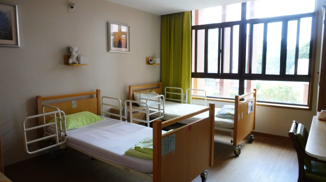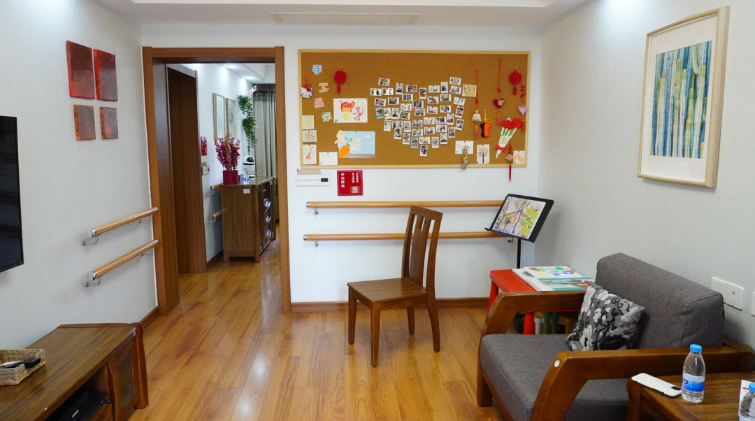 二楼是给老人布置的房间,护理床、紧急呼叫器、安全扶手都是标配