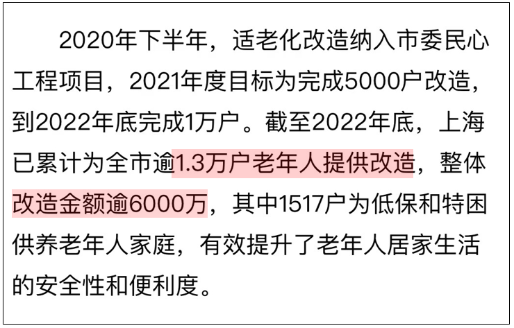 截至2022年底,上海已经累计为全市逾1.3万户老年人提供改造,整体改造金额支出超过6000万