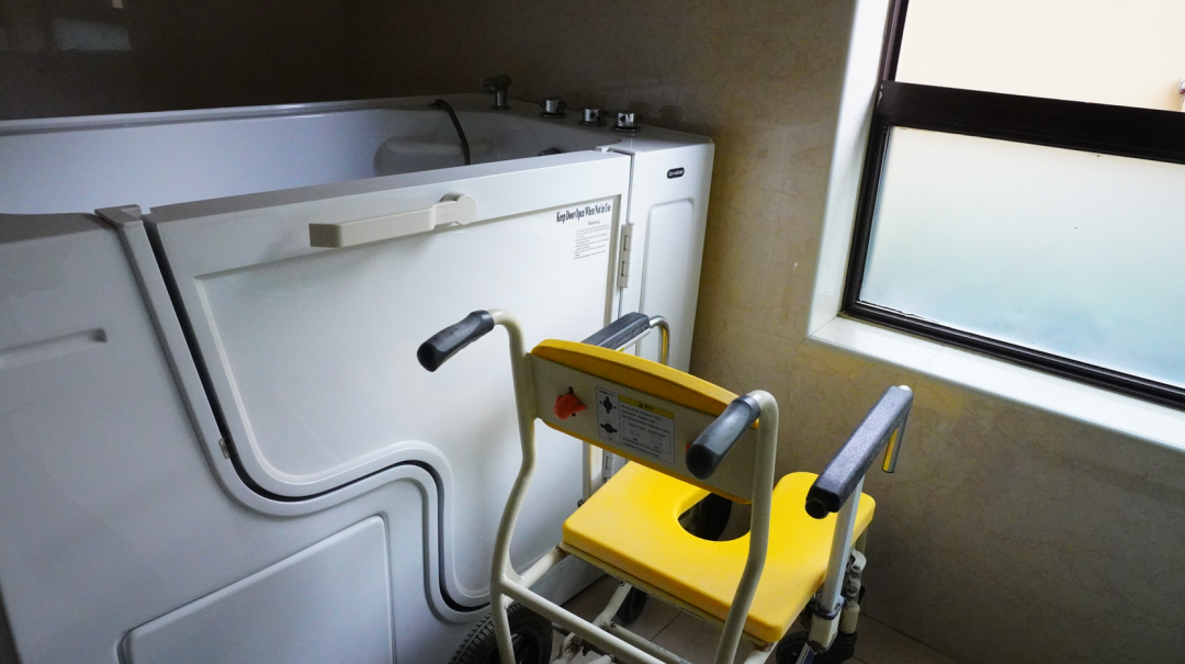如果需要坐轮椅或者行动无法自理,他们会有专门的护理员,帮助老人在浴缸里洗澡