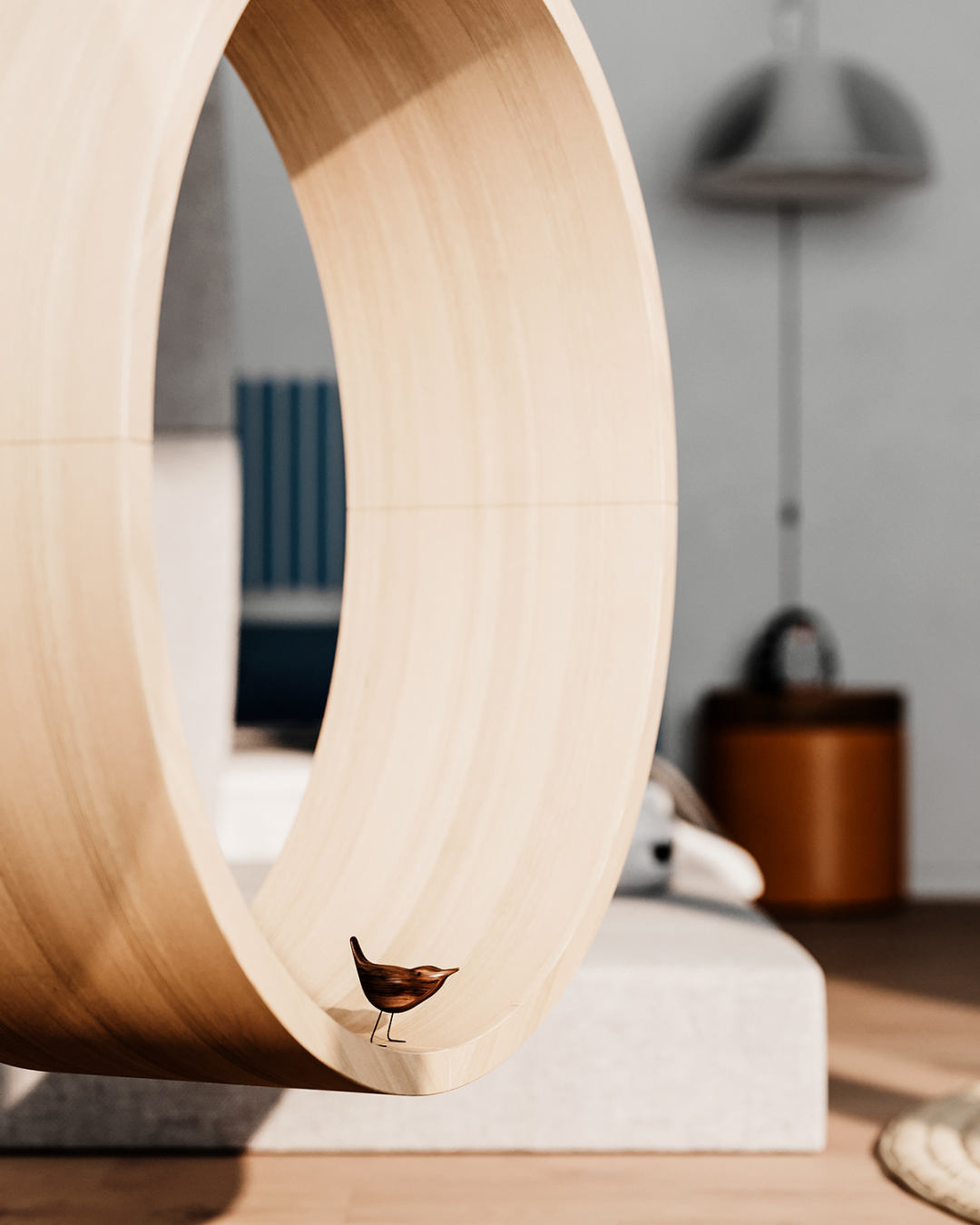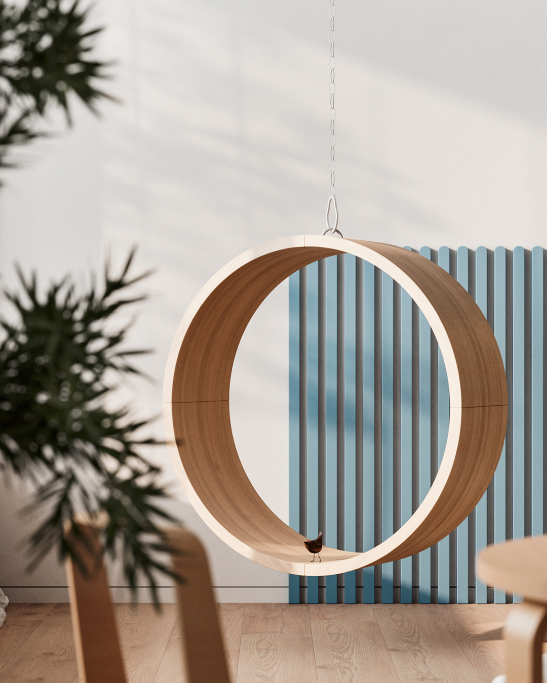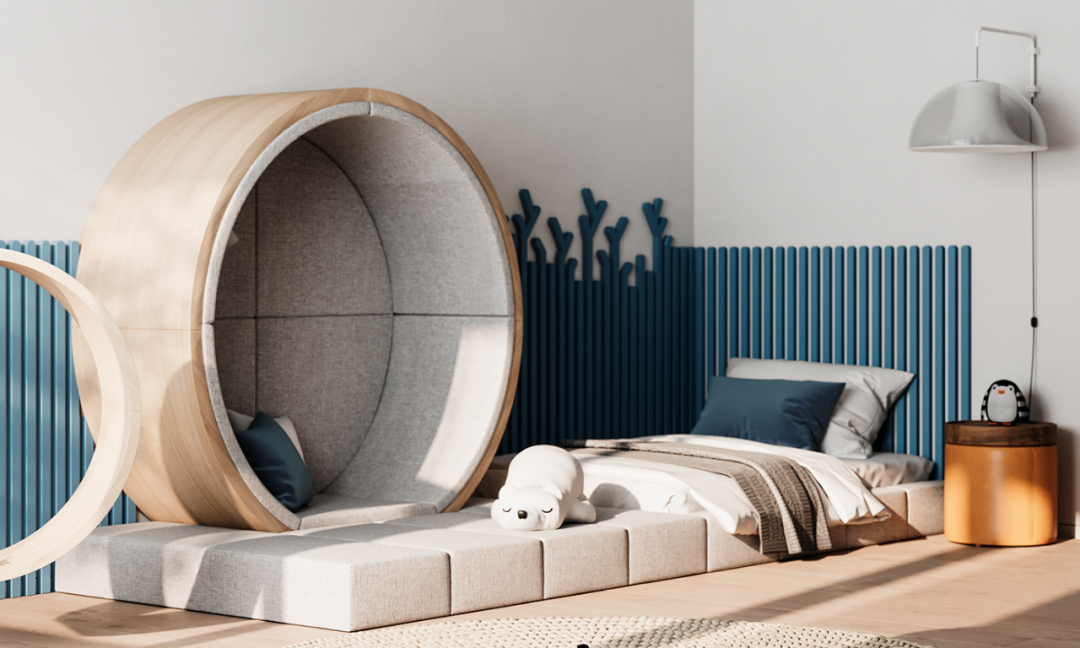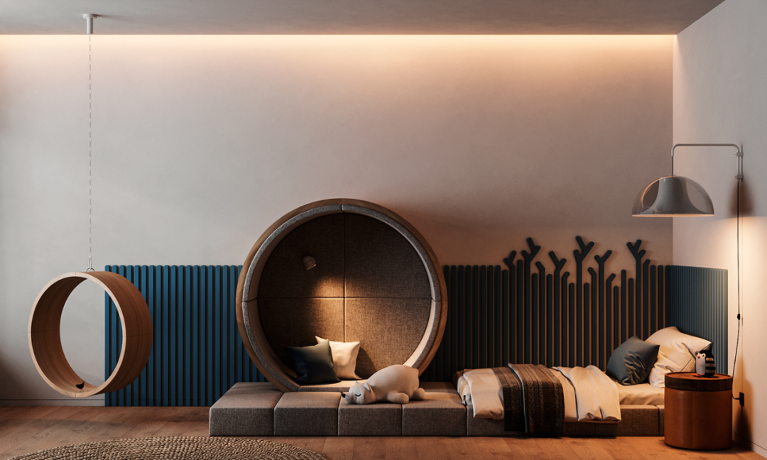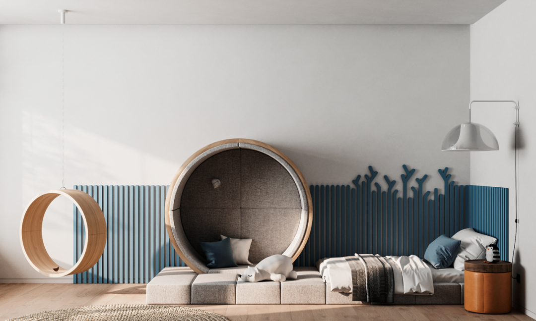 圆形吊椅满足了让孩子躺在里面仿佛睡在一抹弯月上,也给小朋友提供了一个学习、玩耍的好环境。
