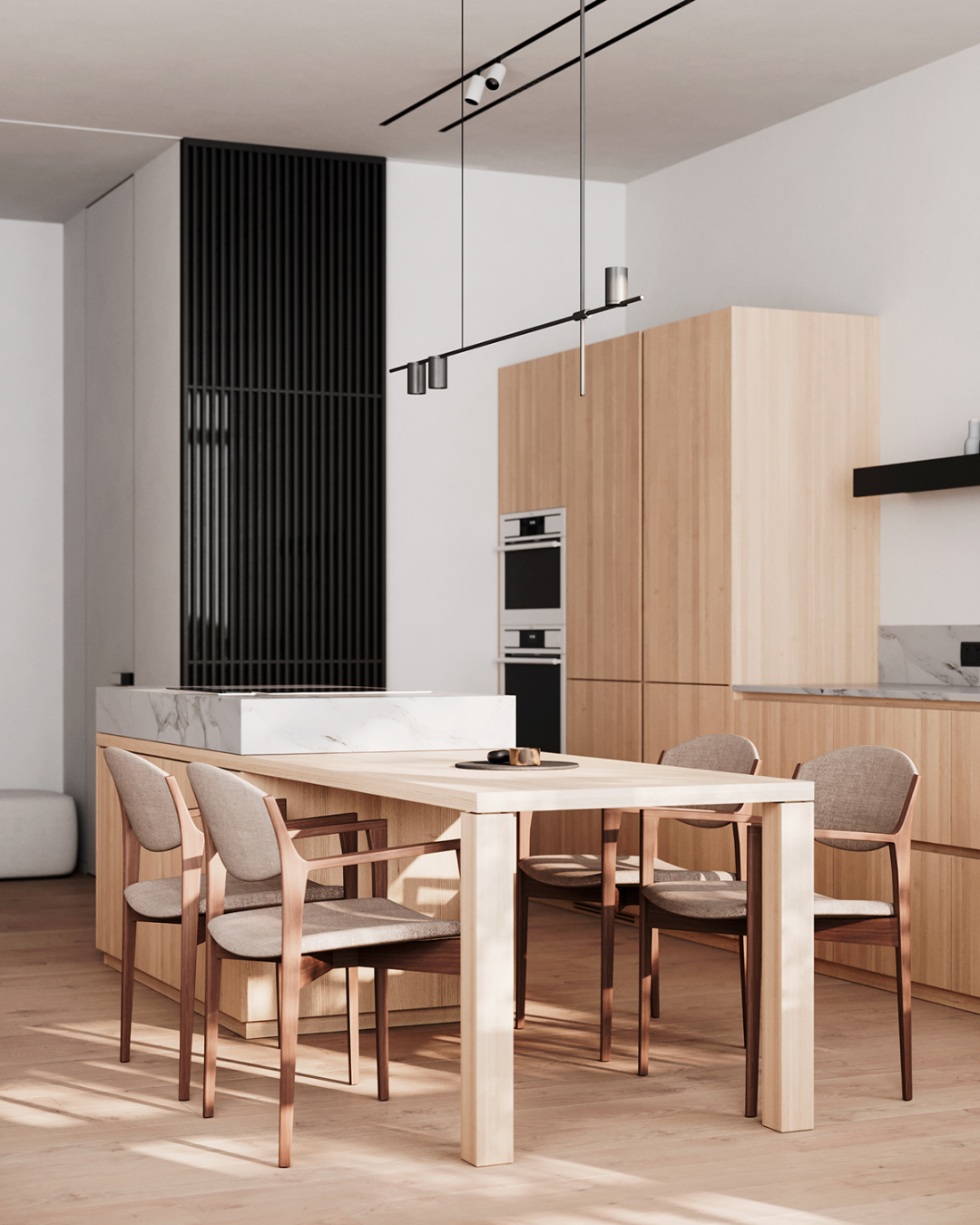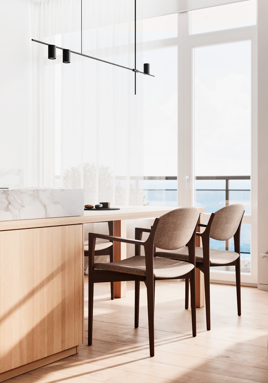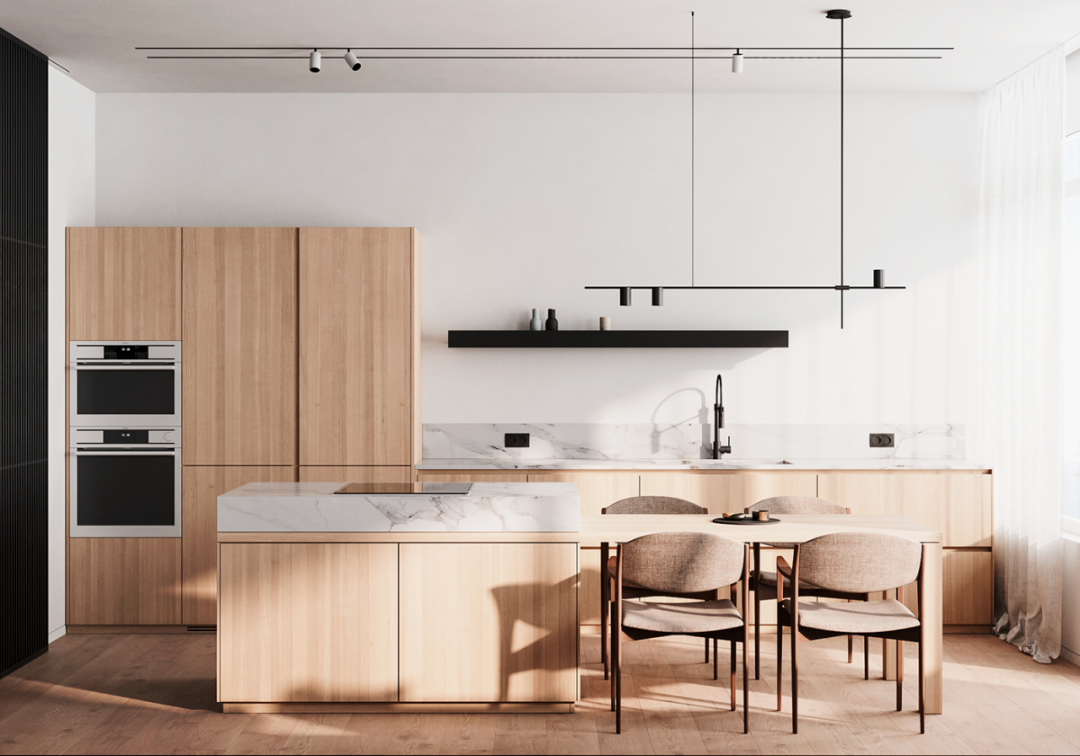 厨房延伸客厅装饰的风格采用了原木作为主色调,在保持一体性的同时,利用少许黑色装饰作为点缀,让阳光透过大面积的落地窗洒进室内,营造出温馨明亮的用餐氛围。