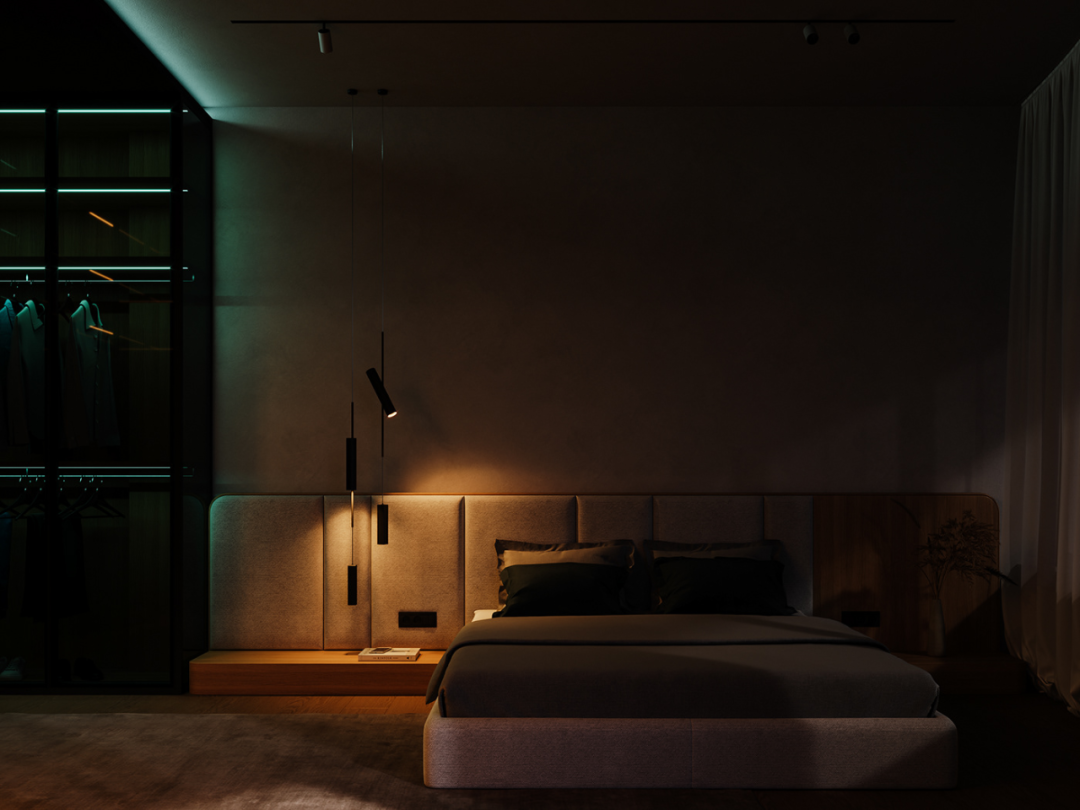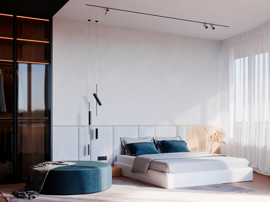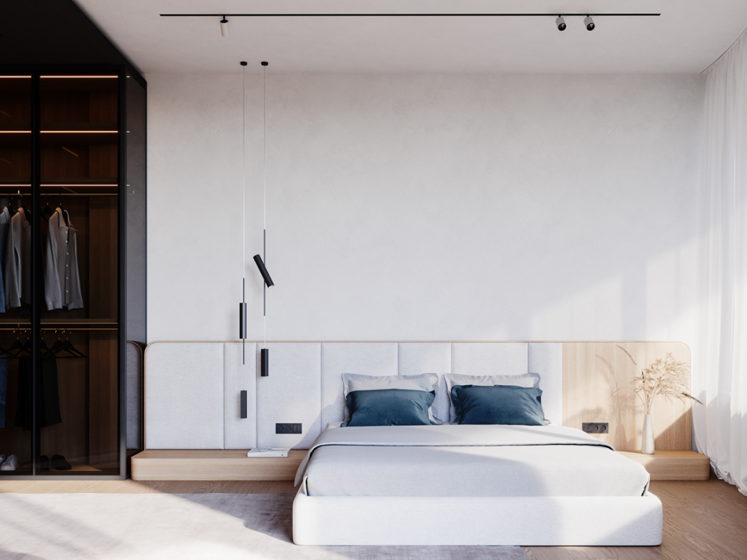 暗棕和白两个色系将卧室划分为休息区和衣帽间,设计师在床头增加了柔软的皮质靠垫,用来缓和墙面带来的冰冷感。