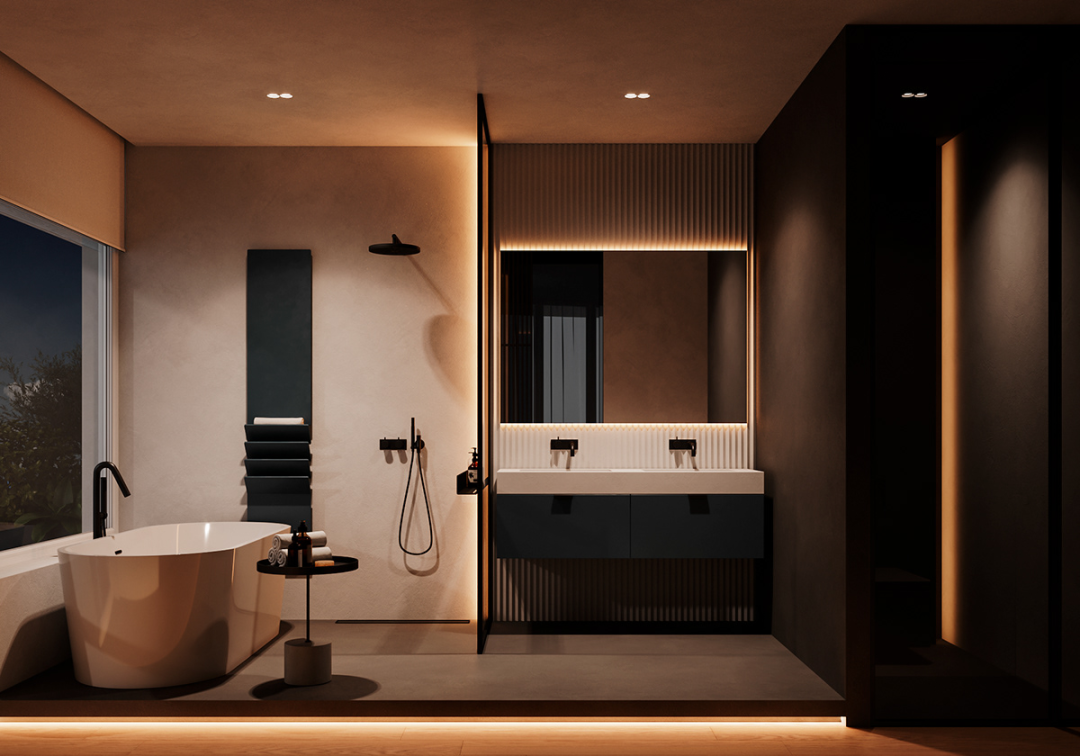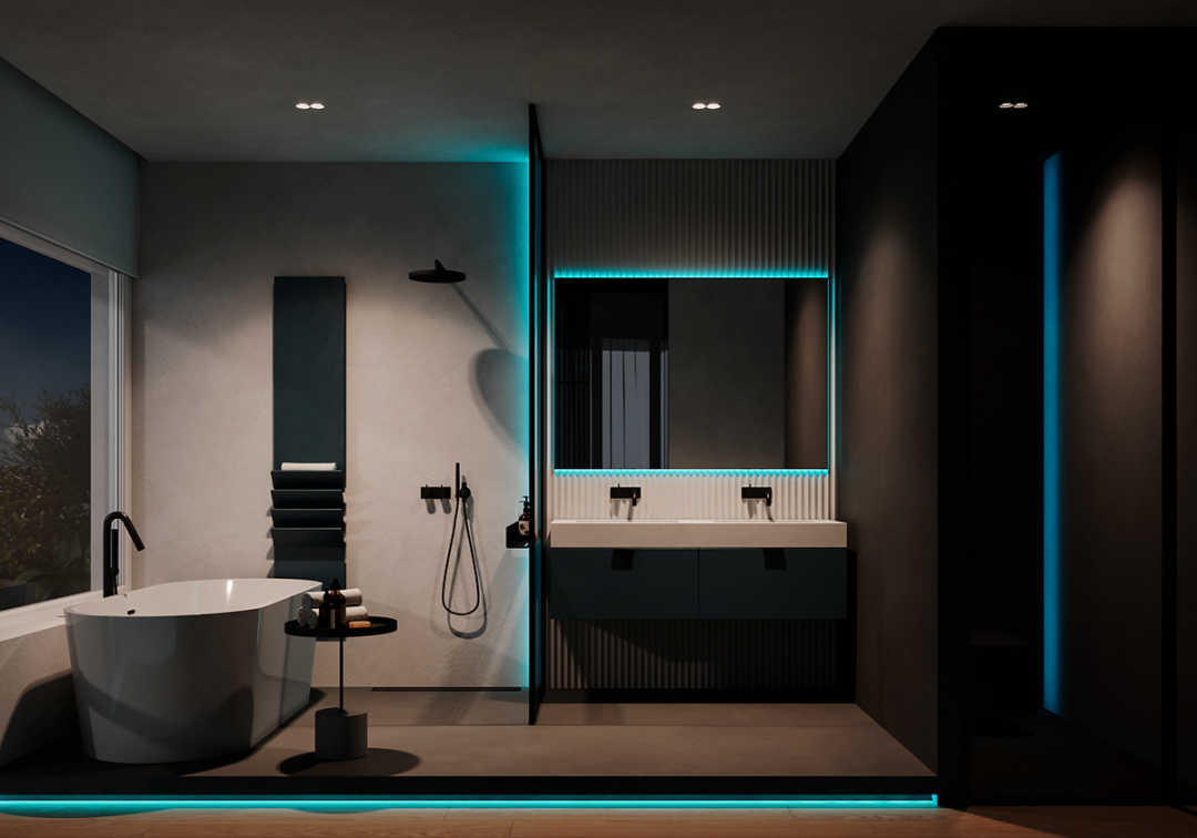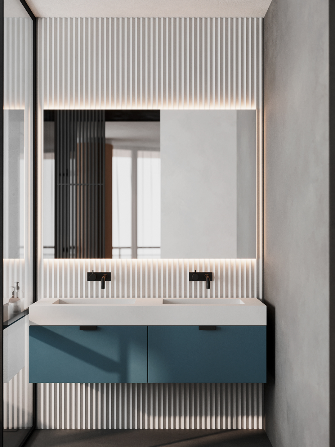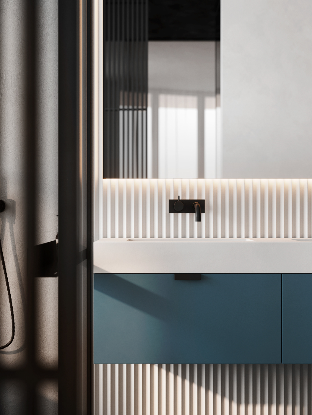 浴室的色调新增藏蓝色的版块,中间的隔板形成了半干湿分离的状态,隐藏的灯带在野外开启时增添了些许浪漫感。