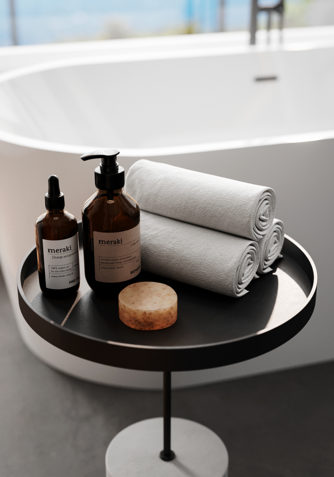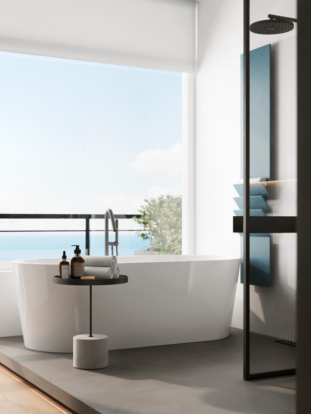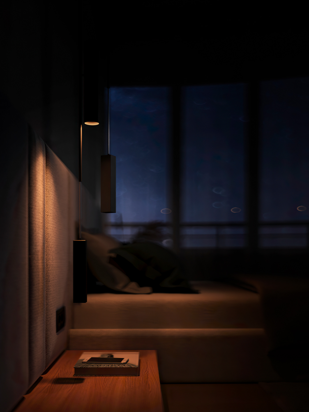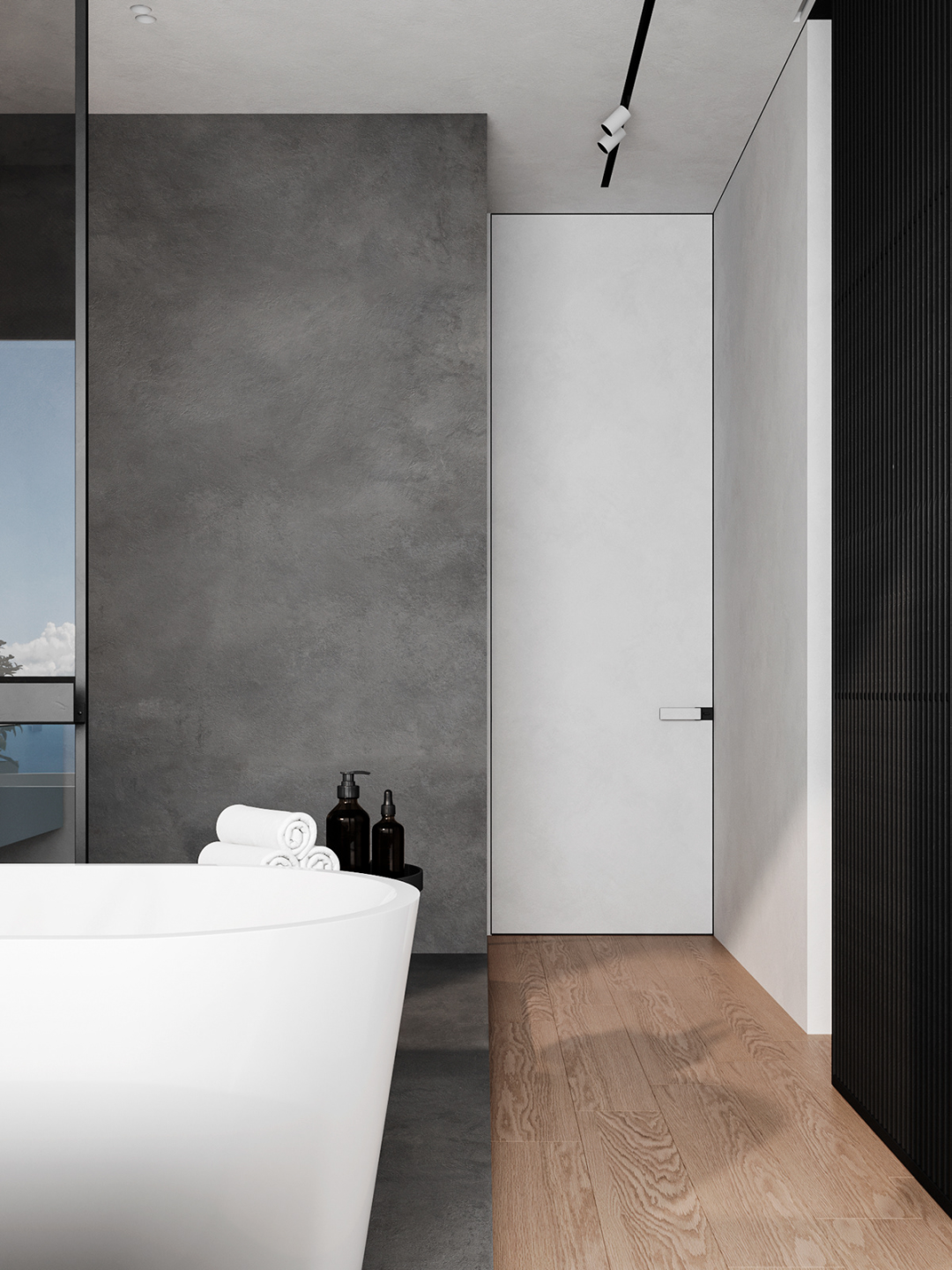 浴室的色调新增藏蓝色的版块,中间的隔板形成了半干湿分离的状态,隐藏的灯带在野外开启时增添了些许浪漫感。