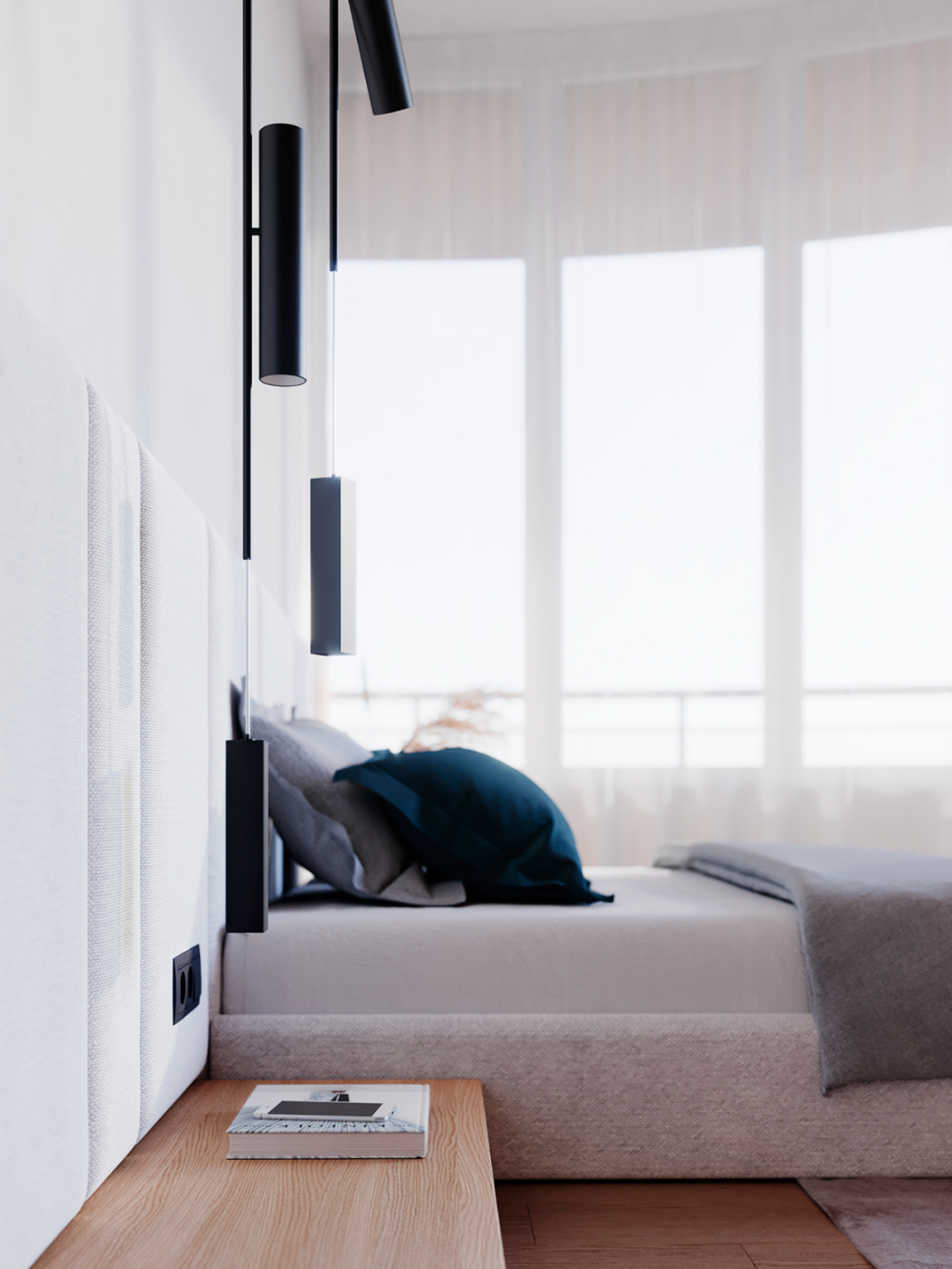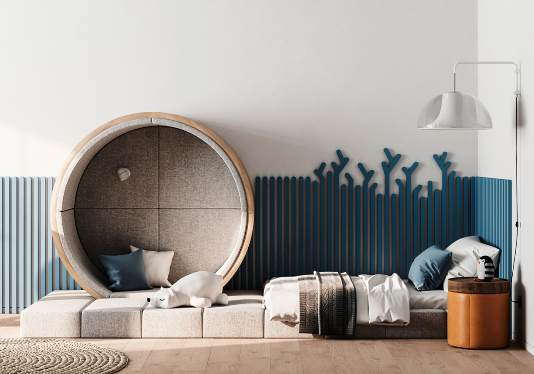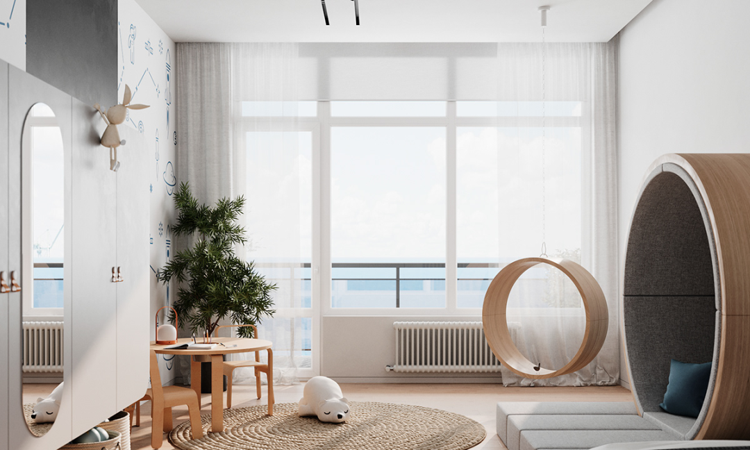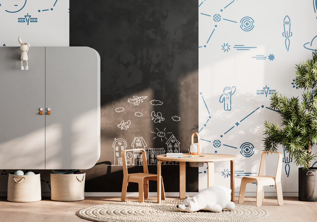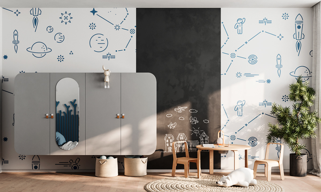 儿童房的悬空圆角衣柜可以保护小朋友在玩耍期间不受伤,简单线条组成的壁画,以及中间的黑板给了孩子自由涂鸦的空间。