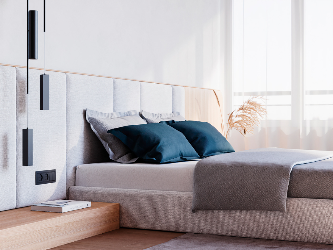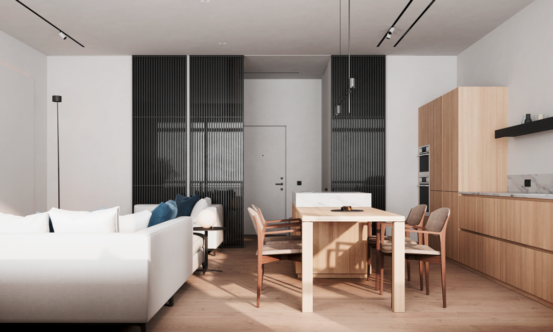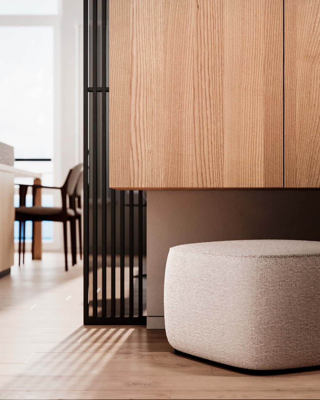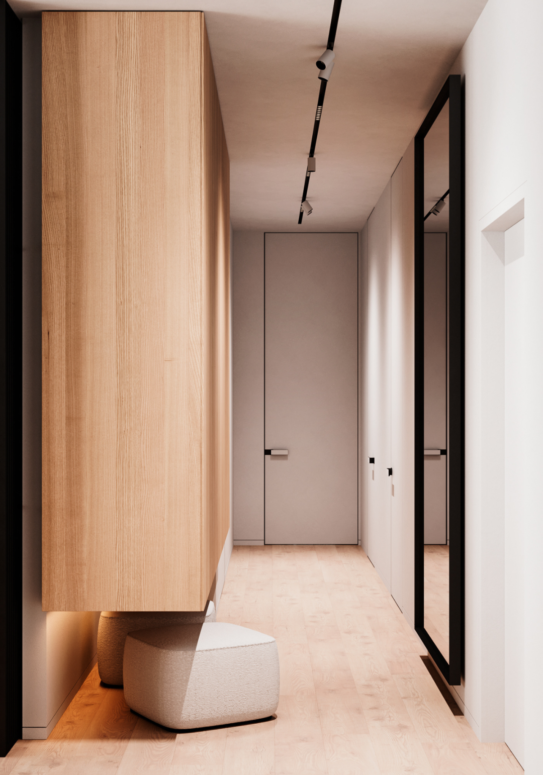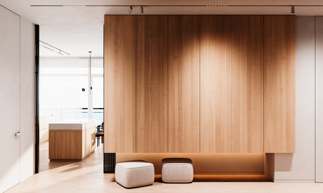 这是Estic Design室内设计工作室新近完成的一间公寓设计。入口玄关处做了悬空的鞋柜,下面可以收纳换鞋凳,使用起来比较不占空间。