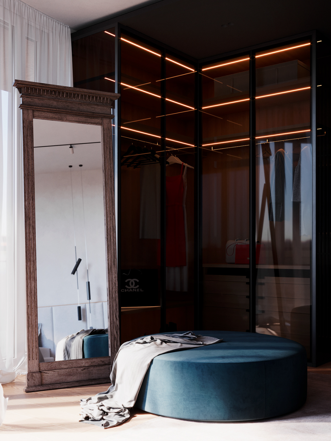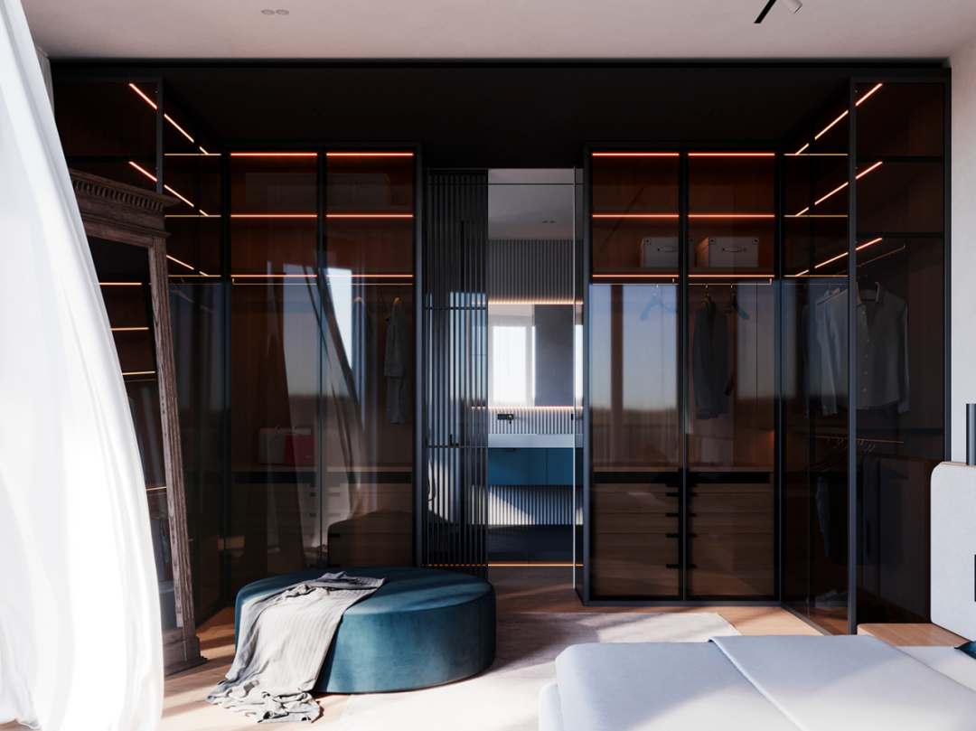 暗棕色调的衣帽间使用咖啡色玻璃隔断,有效地隐藏了橱子里的内容物,起到了很好的遮蔽性。