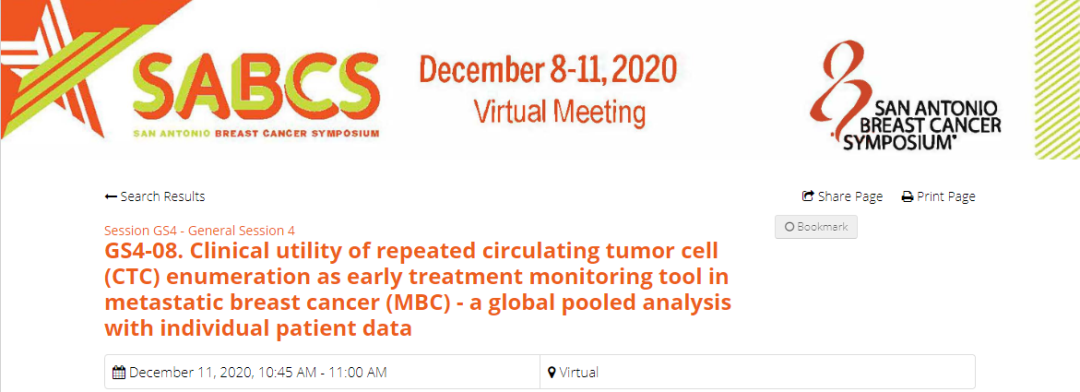 2020年12月11日,圣安东尼奥乳腺癌研讨会(SABCS)线上举办,会议期间公布了一项全球性“关于循环肿瘤细胞(CTC)计数预测转移性乳腺癌(MBC)预后和疗效的14个临床试验的合并分析”结果,结果显示:在治疗开始后第29天(26-54天),连续对CTC进行评估可以有效预测转移性乳腺癌的总生存期(OS)。