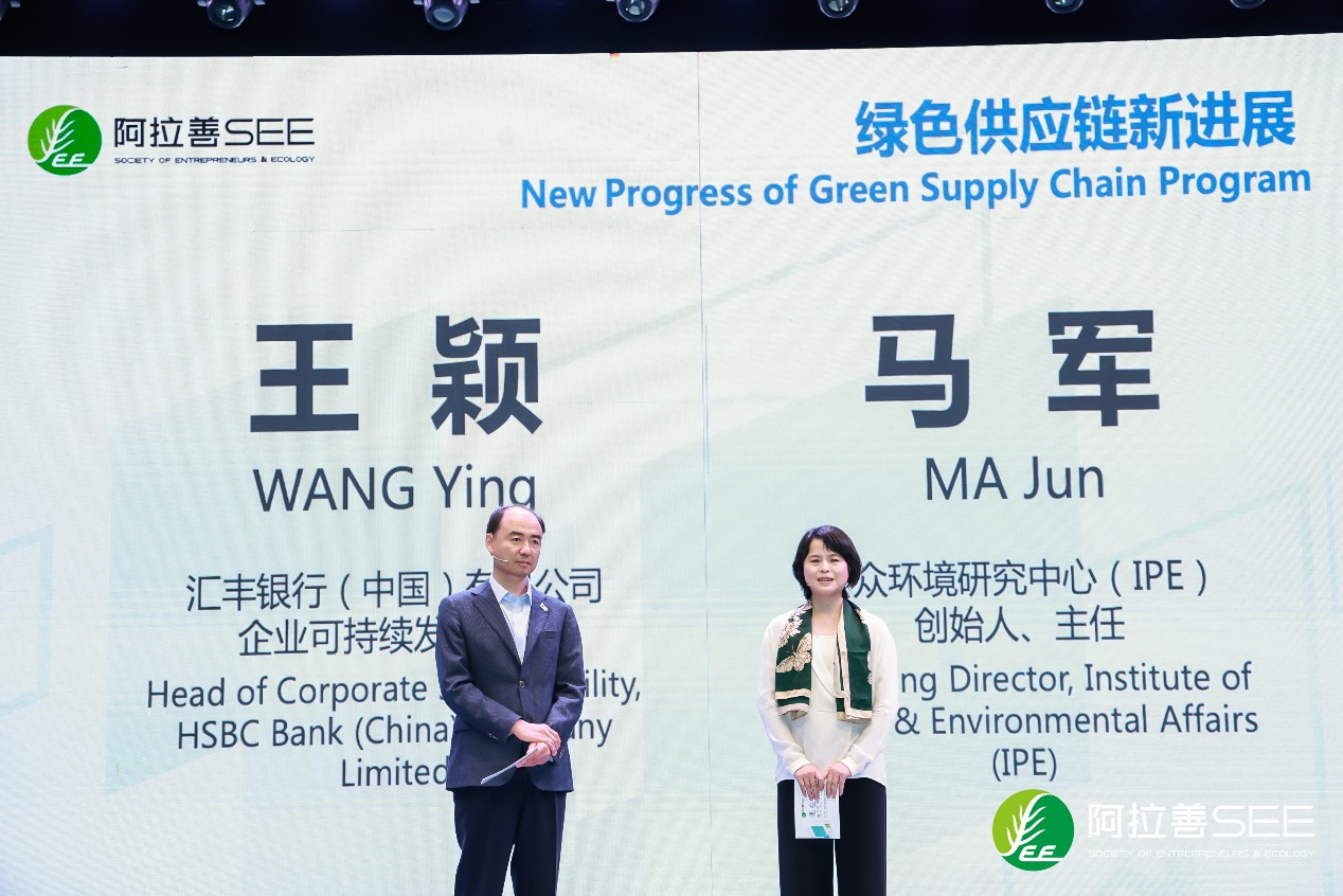 公众环境研究中心(IPE)创始人、主任马军(左),汇丰银行(中国)有限公司企业可持续发展总监王颖(右)发布绿色供应链首批“绿名单”。