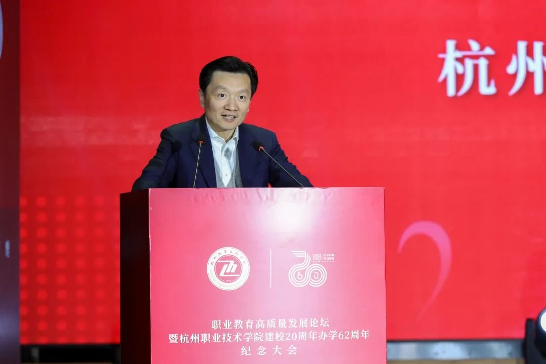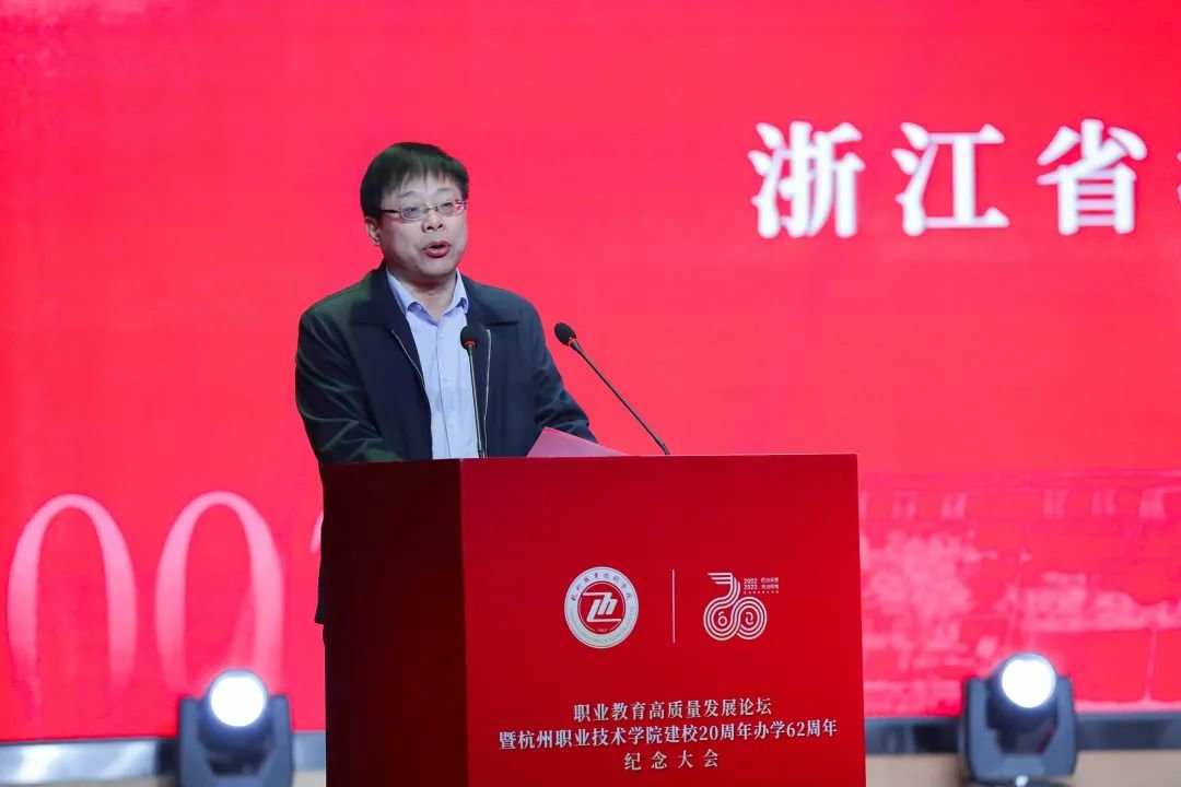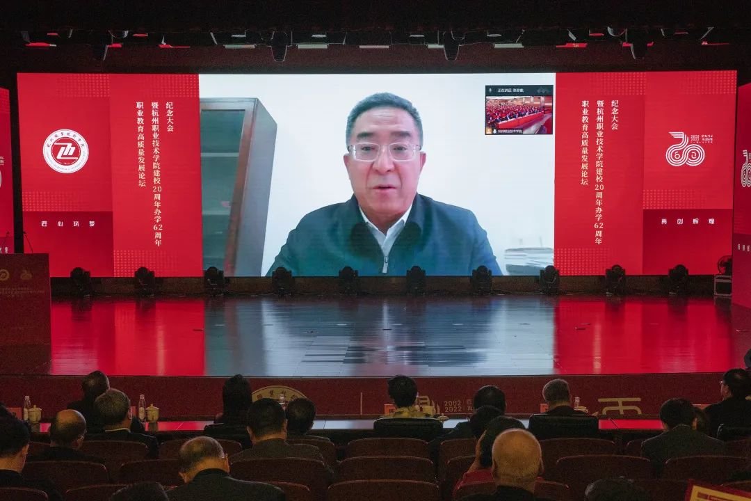 教育部职业教育与成人教育司副司长张俊喜应邀通过云端出席大会并致辞。张俊喜表示,职业教育前途广阔大有可为,教育数字化转型是大势所趋,要在高质量发展中大有作为,希望杭职院在继承中开新局、在创新中谋新篇,打造具有浙江特色的职业教育高质量发展样板。