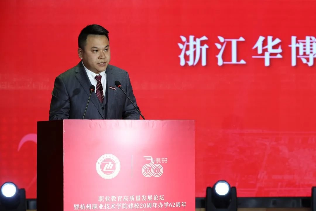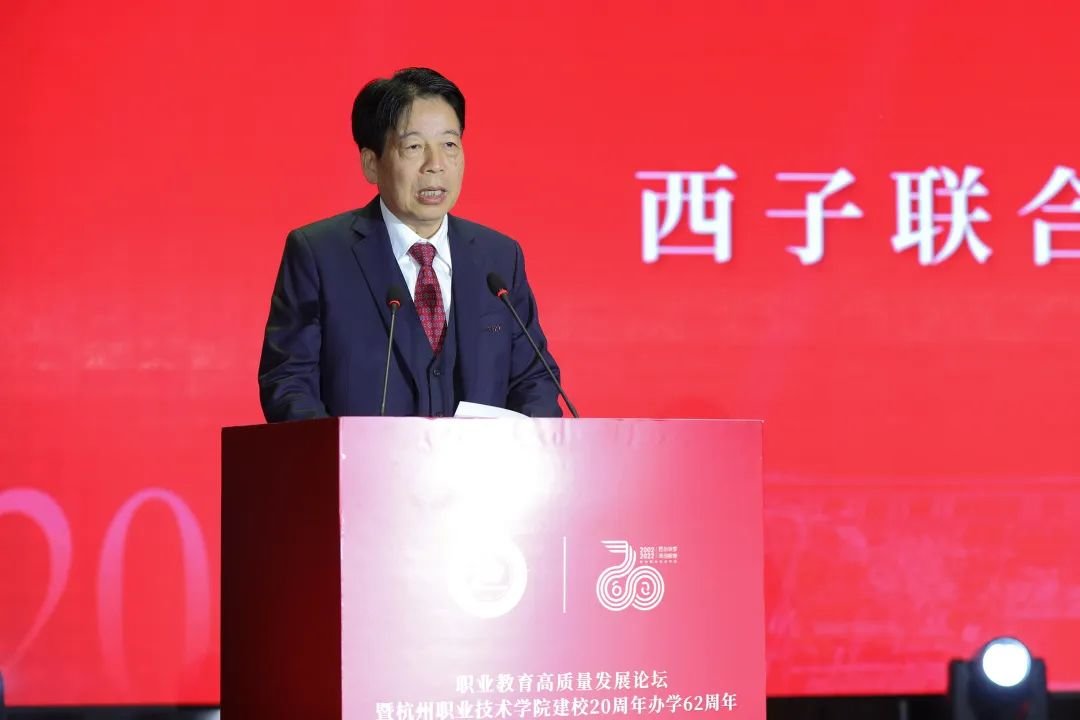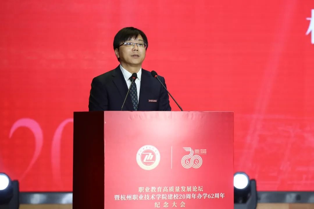 杭职院党委书记金波在致辞时感慨地说,建校20年以来,杭职院因“杭”而生、始终与杭州发展同频共振,锚“职”发展、探索职教改革的“杭职路径”,以质立“院”、高质量发展赋能中国式现代化建设。他表示,面对职业教育大改革大发展的历史机遇,杭职院将准确识变、科学应变、主动求变、创新引变;以更大的勇气智慧,把握规律,攻坚克难;以更高的发展水平,提升形象,担当使命。以建校20周年办学62周年纪念大会为契机,秉承前志、担当奋进,以更加高远的追求、更加昂扬的精神、更加奋进的姿态,在内涵发展、特色办学的道路上迈出更加坚实的步伐,奋力建设国内一流、国际上有较大影响力的“高职名校”,以优异的发展成绩践行党的二十大精神,在全面建设社会主义现代化国家、实现第二个百年奋斗目标、以中国式现代化全面推进中华民族伟大复兴的伟大征程中展示杭州职教风采!