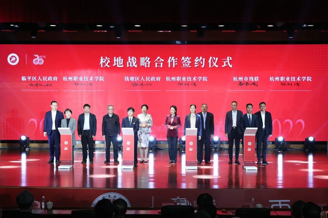 纪念大会上,杭职院与钱塘区、临平区、市残联等部门签署了校地战略合作协议,将在深化人才共育、促进创新创业、深化校企合作、试点开放校园、服务区域发展等方面展开深入合作。