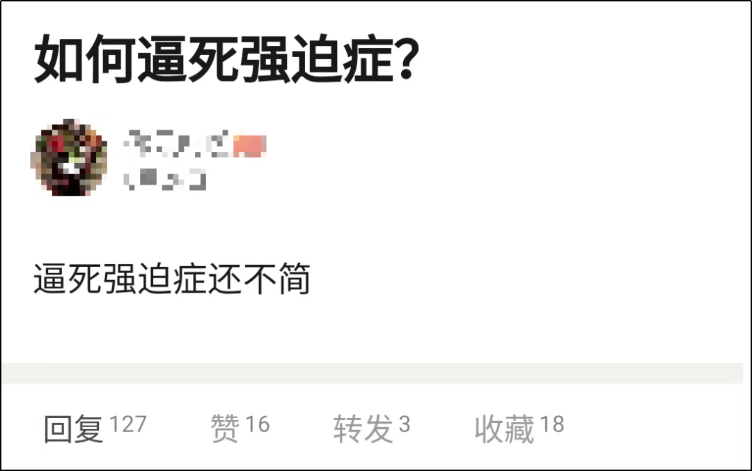 有一种“网红”心理疾病叫强迫症,据说在中国有7亿强迫症患者,而另外7亿没病的就负责琢磨怎么逼死那些有病的。