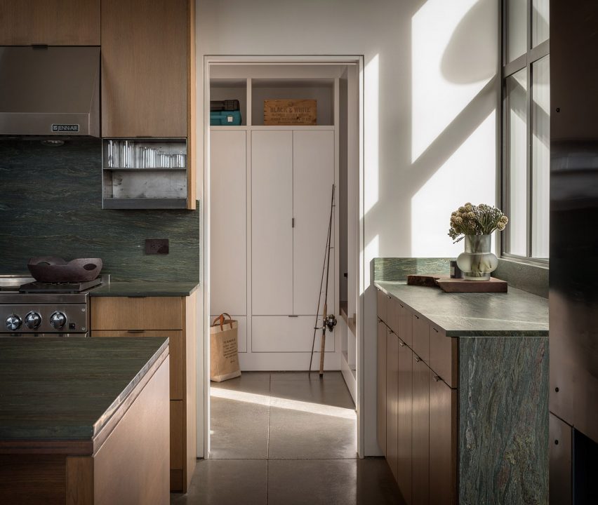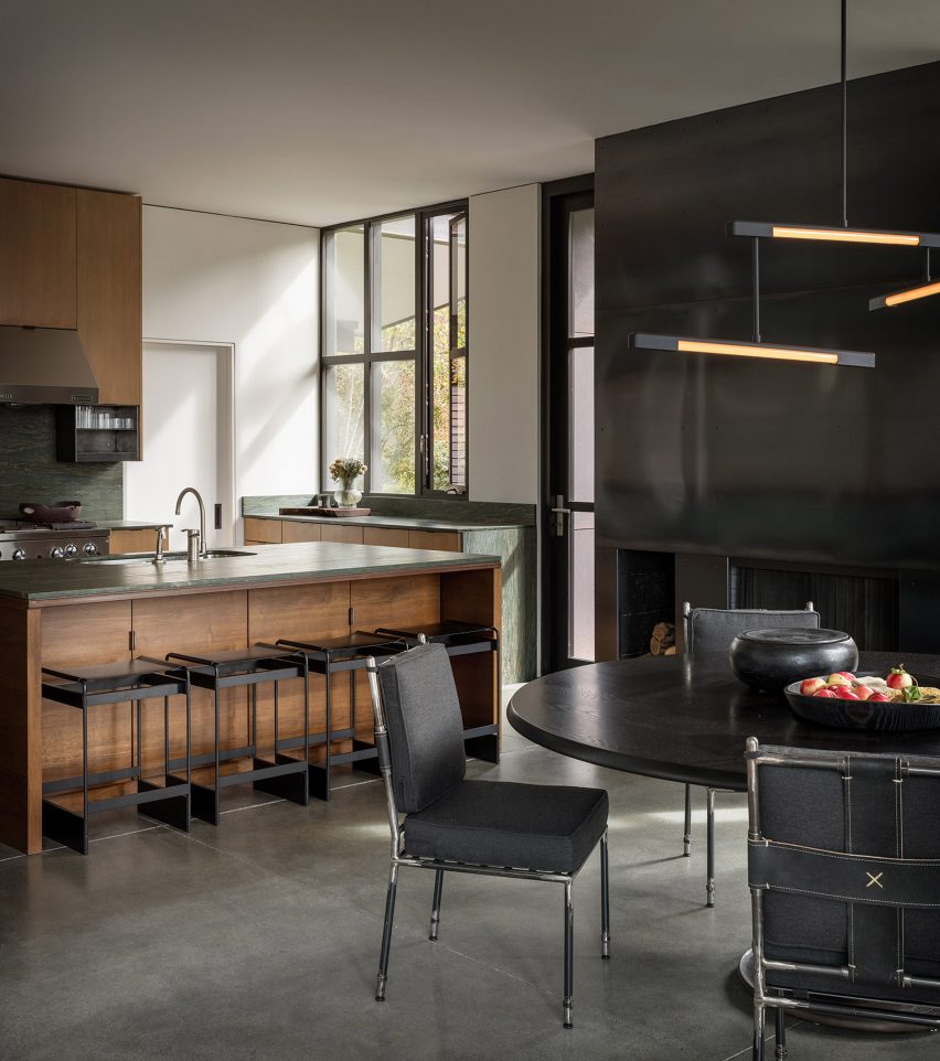 厨房配有绿色皂石台面和橡木贴面柜,配有Olson Kundig设计的硬件。加入这个空间的是一间配有深色椅子和Nolan餐桌的餐厅,均由Troscan Design设计。甲Wintercheck厂在由书柜的顶光WUD家具,并且通过一消光黑色三层灯具玛丽沃利斯是另件之间。 约翰·埃里克·拜尔斯(John Eric Byers)还有一个黑色枫木座椅和位于酒店入口处的Sabine Marcelis的Seeing Glass镜子。
