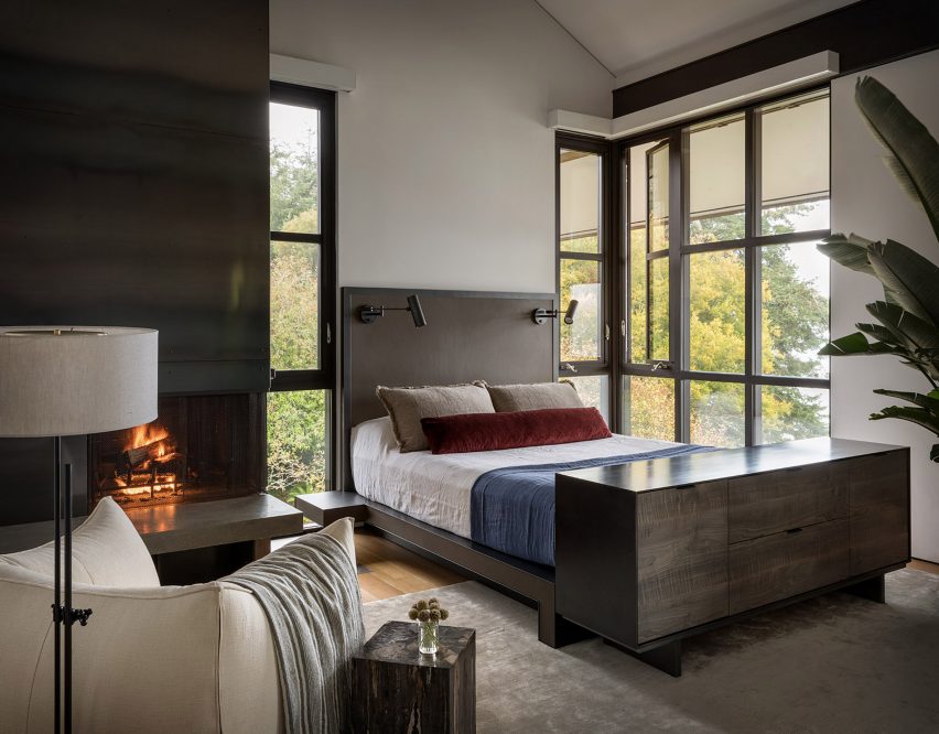 底楼设有门厅,卧室和储物区,楼上设有额外的起居区,主卧室和连接浴室。 主卧室配有定制皮革和钢床,Geremia与制造商Tod Von Mertens合作设计。客房内的其他细节包括轧钢和Thassos大理石壁炉以及Pamono的老式俱乐部椅。