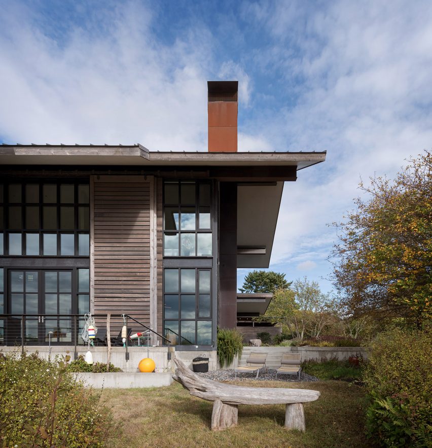 这座两层高的山墙房屋采用垂直木板覆盖,并用大量玻璃刺破,最大限度地扩大了哈罗海峡和奥林匹克山脉的全景。 光线和太阳能热量的增加可以通过四个20英尺高(6米高)的滑动木质百叶窗进行调节,这些木质百叶窗延伸到整个西立面。房子的深屋顶悬垂也遮挡并保护它免受阳光直射和强风暴。