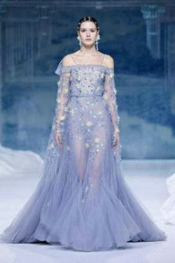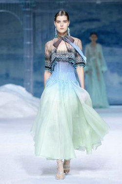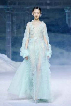 《若雪·初见》灵感源于雪中仙子。青碧色与雪白色的搭配,犹如仙境中的湖泊与冰山。珠饰雪花的形态脉络、花瓣结构剪裁,带人遁入雪花飘零的碧澈青空,如天外飞仙般梦幻飘逸。