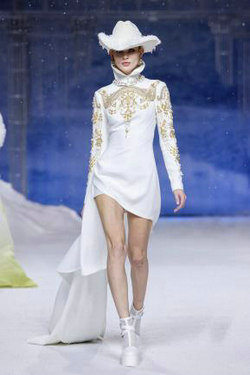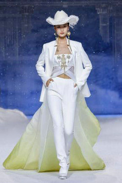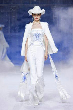 《扎西达杰》灵感源于祥瑞图腾,结合宝伞和吉祥结的纹样。以纯白为基调,制式强调图案与面料之间的立体空间浮雕感。领袖以绒球、羽毛装饰,厚重和轻盈兼顾。
