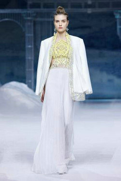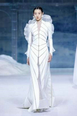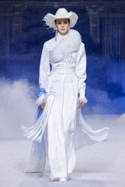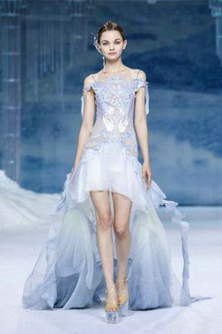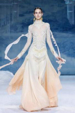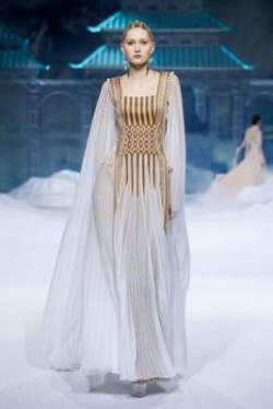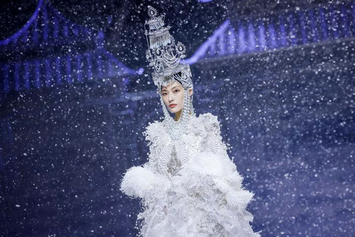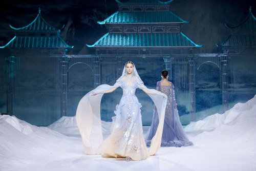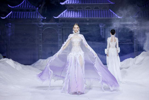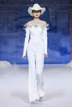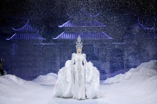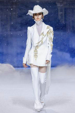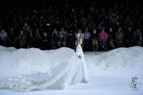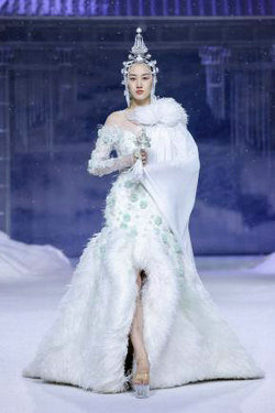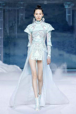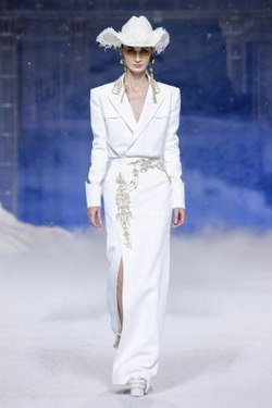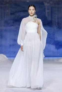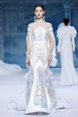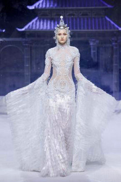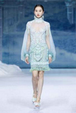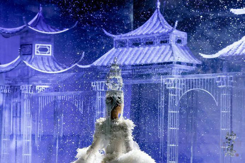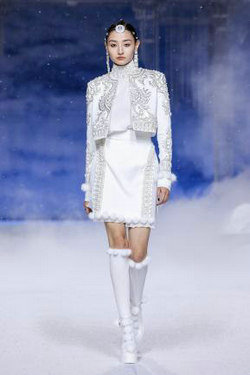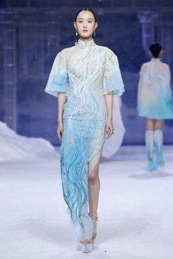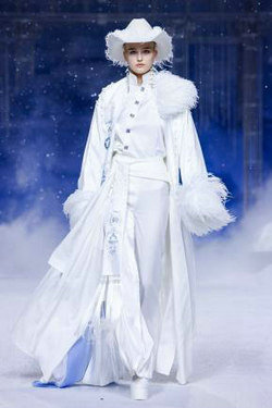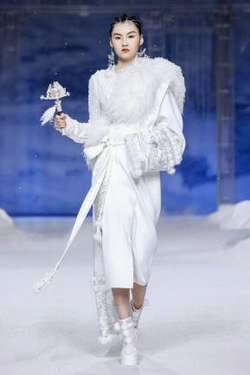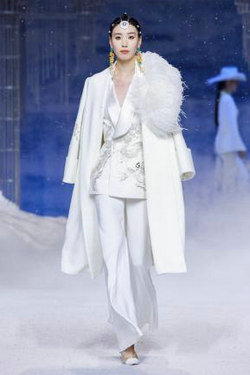 《云顶天宫》灵感源于幻想中飞升的云龙盘旋于冰晶般的宫殿庙宇之上,守护着一方纯净与圣洁。盘银龙于雪域白面料上,灵性优雅中把中国式的建筑和图腾表达的栩栩如生。