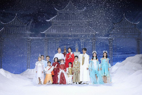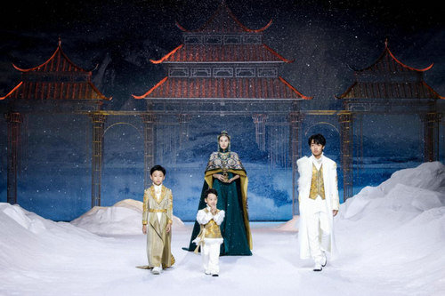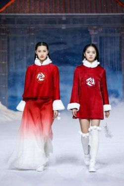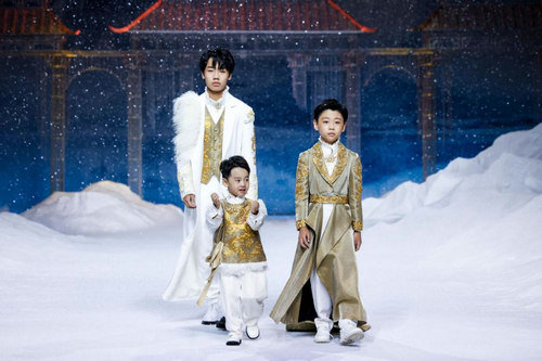 其中“齐氏三兄弟”齐显霆、齐浚廷、齐禹霆备受大家关注,三人身着服饰均以雪山金龙为设计灵感,仿若从云中走来。齐显霆身着一袭白衣映入大家的眼帘,其主色调灵感来源于雪域高原的纯净之白,在衣服的衬托下宛如云中仙君。齐浚廷身穿一袭长外套款款而来,衣服上的每一个纹样均采用宫绣高超的技艺,是匠心与时间的沉淀。齐禹霆身着金色龙纹服饰,金龙栩栩如生,仿佛下一秒便会腾飞而出。“齐氏三兄弟”最本真的童趣与天真,以及温馨互动,让大家体会到了来自家的温暖,小家大爱,最动人心。