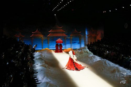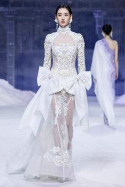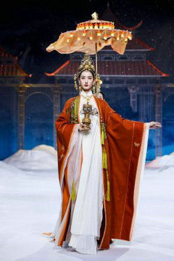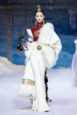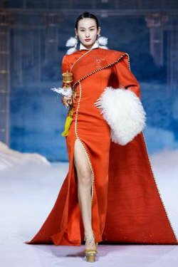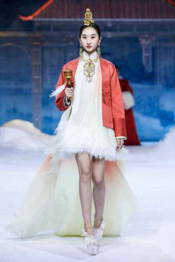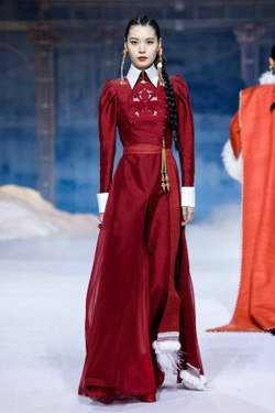 相较于以往的发布会作品,本次发布的服饰作品更具人文情怀。其中首发款,旨在致敬千年前为唐蕃友好和亲的文成公主。红妆摇曳、福相加身、流金溢彩,夺目而庄重的制式华服,将一段流芳千古的史诗佳话演绎传颂。而压轴款的“碧落”款礼服,更是穿越时空,将高山、宫殿、霜花等引人神往的自然与人文元素凝于一身,仿佛翩然而至的不是一款华服,而是沉淀千年的空灵之梦。