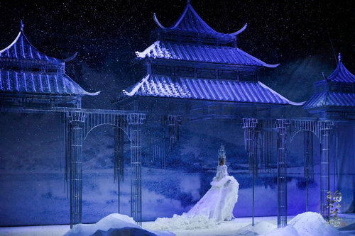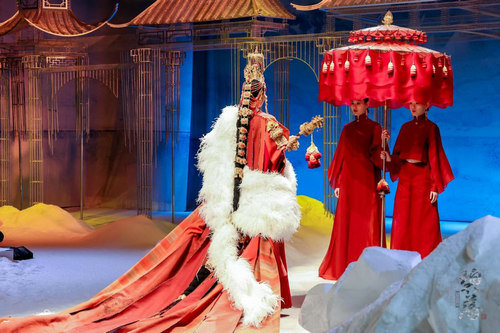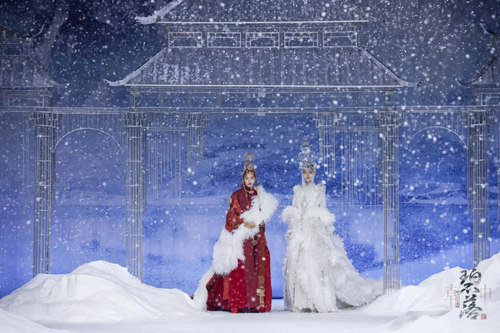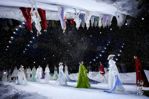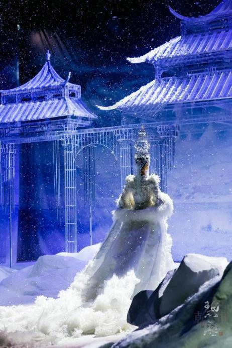 本次秀场,在一曲空灵的妙音中,和营造的高山雪景中拉开序幕,秀场中纷飞的雪景,萦绕整个舞台,让观众沉浸在满天飞雪的意境中,仿若置身神圣、纯净的雪山圣域。高远、悠长的音乐涤荡心灵,打造出一场极具自然震撼力且惊艳众人的视听盛宴。