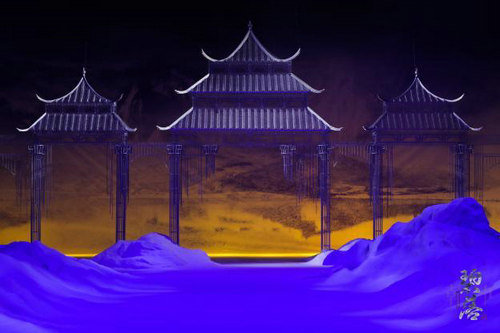 《雪域红殿》灵感源于宫殿,红白宫相映、鎏金宝顶,气势恢宏。吸取了长袖,对襟,不对称斜裁,配以灵花、宝瓶、菱格等图样,金线钩绣,光彩夺目的设计灵感。