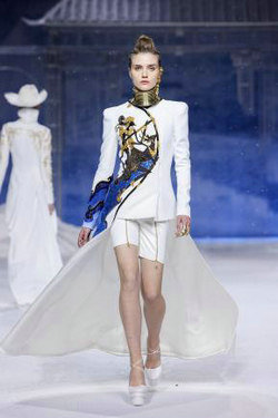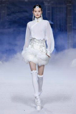 所发布的服饰作品围绕着本次大秀的主题,以“自然”和“文明”两个角度去阐述“信仰”和“传承”的力量。雪域的天空、雪山等自然人文景元素融入设计之中,以服装为载体,意象化的神秘的“天空之境”。