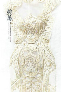 《曜灵·圣境》灵感借用螭吻、吉祥八宝、璎珞垂铃等吉祥纹样,秉承古为今用的设计手法。以纯白为基调。金属图腾点缀其中,生机盎然。