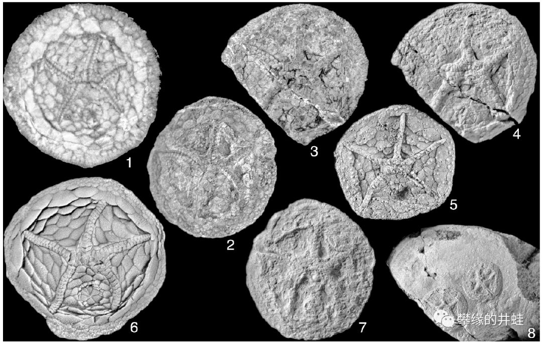 另一个在二叠纪末陨落的棘皮动物类群是海座星纲(Edrioasteroid)。这类既像海星又像海胆的小动物在寒武纪就已经出现。二叠纪海座星只在俄罗斯发现了少量化石,全都属于Neoisorophusella属(如上图)。这是这个家族的最后一缕余晖。图片来源自[3]。