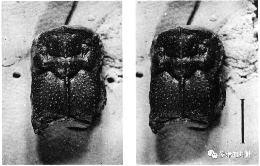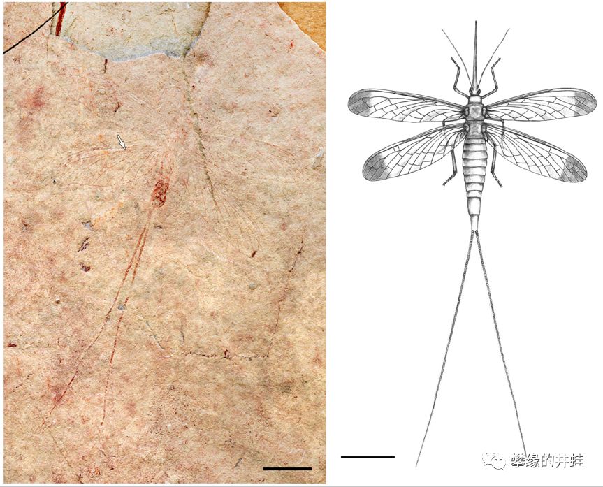 我国发现的晚二叠世魁翅目昆虫Brodioptera sinensis(应该是叫中华什么虫,井蛙没查到中文名)化石和复原图。魁翅目(Megasecoptera)是一类长着刺吸式口器的古翅类昆虫,在二叠纪末灭绝。图片来源自[15],标尺长度1厘米。
