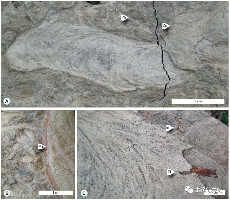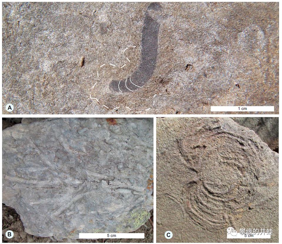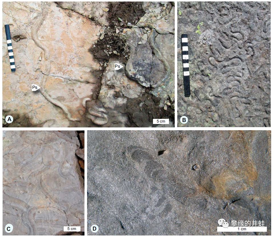 意大利和奥地利交界的普拉莫洛盆地(Pramollo Basin)发现的早二叠世海洋动物足迹化石。在大约3亿年前,这里曾经是位于赤道附近的河流入海口。肥沃的沉积物养活了大量蠕虫,双壳类,腹足类,环节动物,节肢动物,还有其他许许多多的底栖小动物。它们柔弱的身体早已消失得无影无踪,然而留在淤泥上的洞穴和爬痕居然奇迹般地石化保存下来。图片来源自[1]。