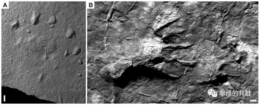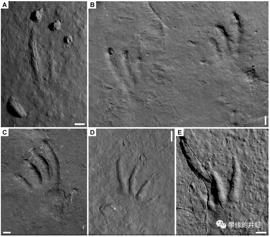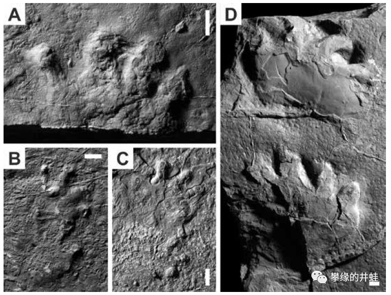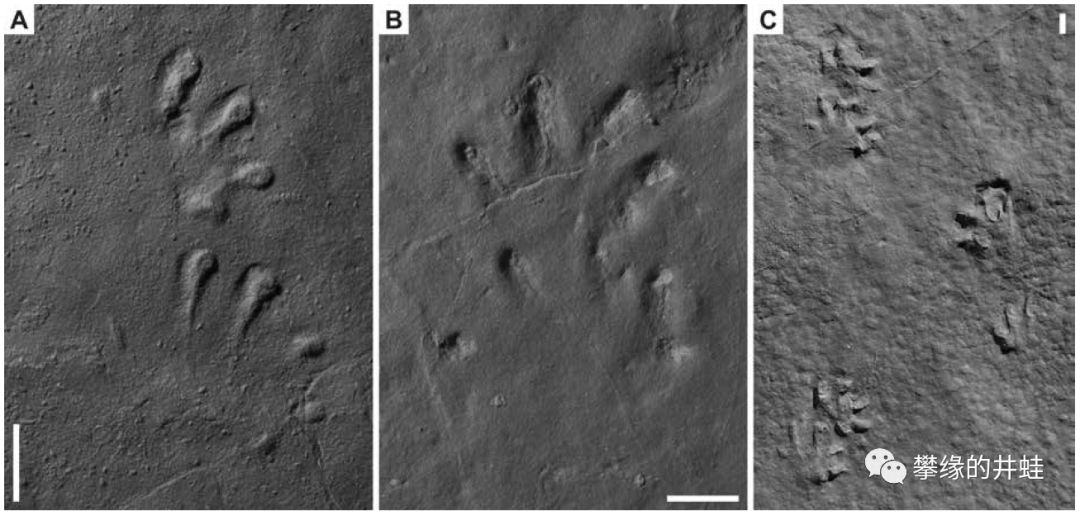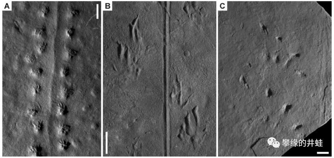 一些早二叠世四足动物足迹化石。留下这些足迹的动物可能包括引螈,双疏螈,鳞鲵,阔齿龙,楔齿龙,蜥代龙,大鼻龙,副爬行动物等等。它们全都没能跨过PTB这条死线。图片来源自[14],标尺长度1厘米。