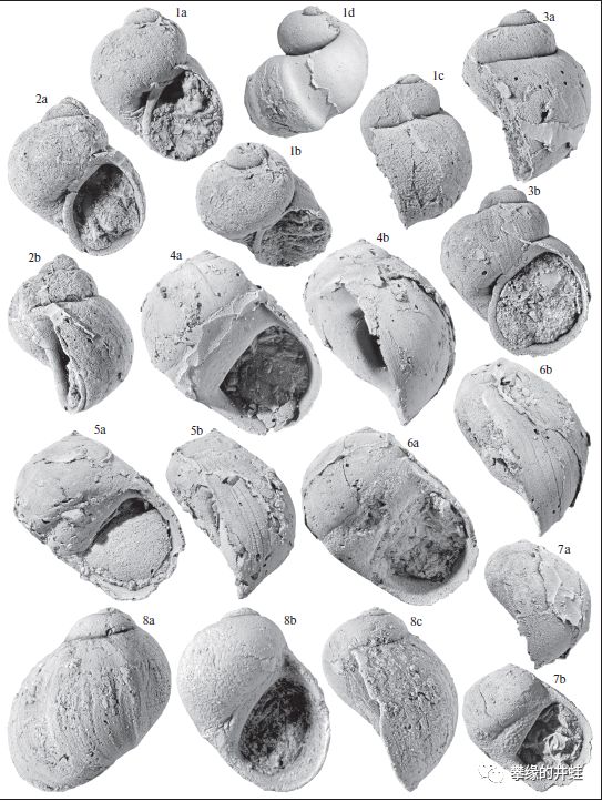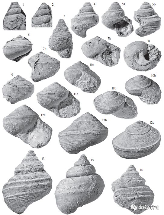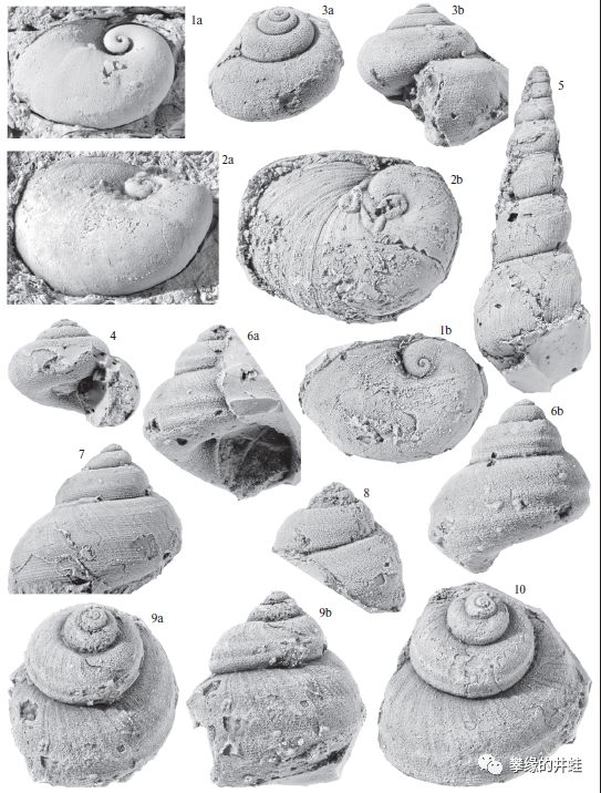 俄罗斯发现的中二叠世古腹足类化石,看上去和今天常见的螺蛳好像也没什么区别,图片来源自[7]。很可能是因为繁殖方式的原始(没有交配器官,体外受精),古腹足类在大灭绝之后逐渐没落。现存的古腹足类(包括鲍科Haliotidae,裂螺科Fissurellidae等)全部海生,大约3700种[8],占腹足纲(超过10万种)的比重几乎微不足道。