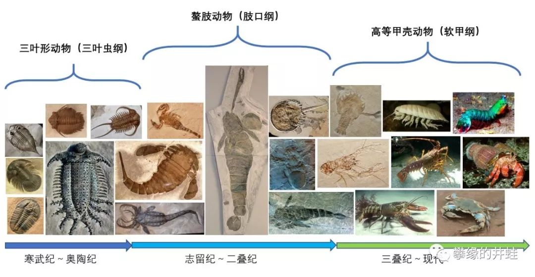 简单做了一张图。海洋节肢动物清晰地显示了三大演化动物群的更替。从寒武纪演化动物群(CambrianEvolutionary Fauna),代表:三叶虫;到古生代演化动物群(PaleozoicEvolutionary Fauna),代表:板足鲎;再到现代演化动物群(ModernEvolutionary Fauna),代表:软甲纲甲壳动物。