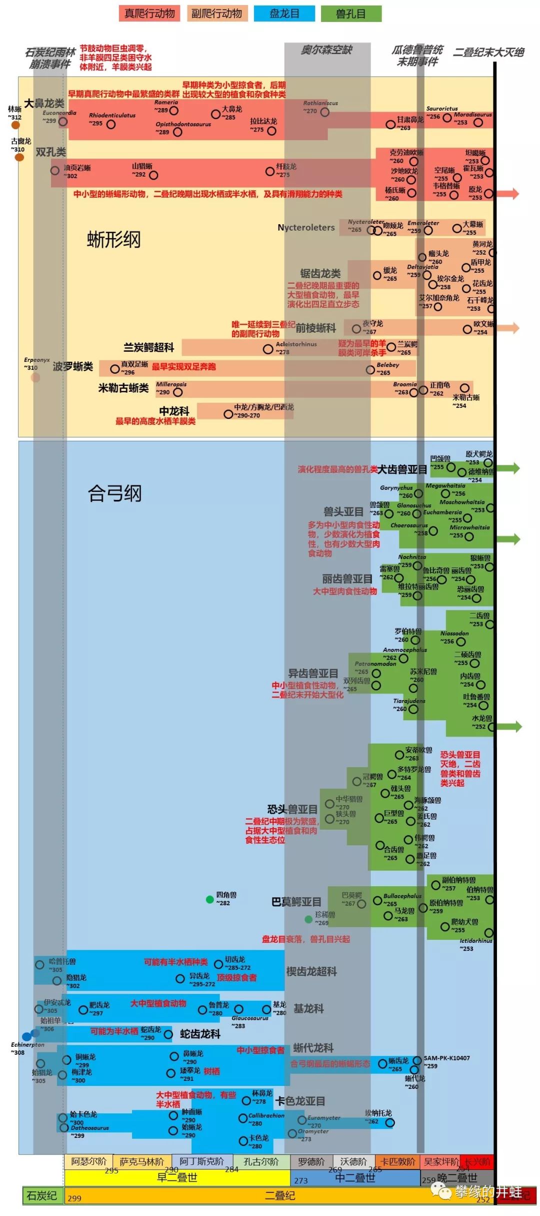 井蛙做了这张图来说明蜥形纲与合弓纲第一回合(古生代)的战况。基龙,杯鼻龙,麝足兽,锯齿龙这样的大草包;异齿龙,巨型兽,安蒂欧兽,狼蜥兽这样的超级杀手,在二叠纪来了,又走了。残存的兽头兽和二齿兽在三叠纪短暂地回光返照之后灭绝,只剩下犬齿兽一支蜷缩在蜥形纲的阴影之下。