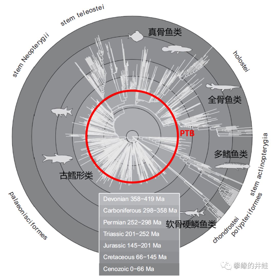 硬骨鱼类主要类群的演化谱系和生存年代。古鳕类在PTB之后迅速衰落,三叠纪末又遭受一次重击,把生态位让给了更快,更灵敏,摄食能力更强的新类群。图片来源自[13]。