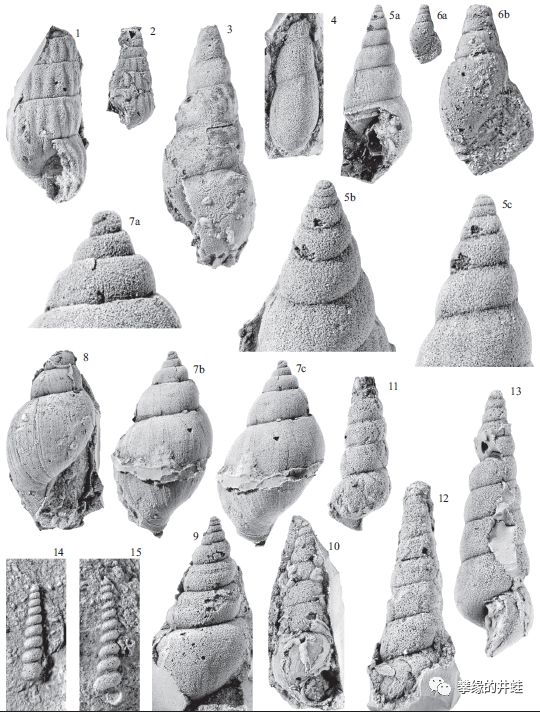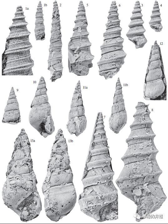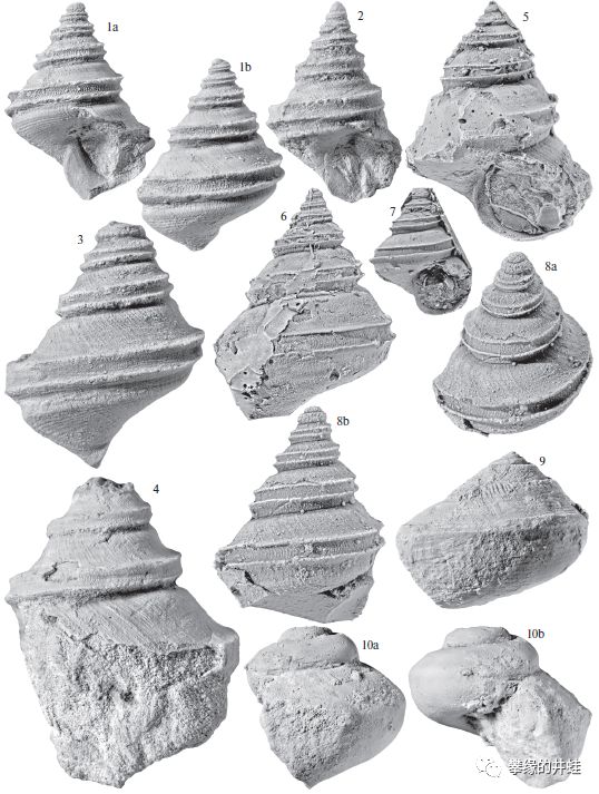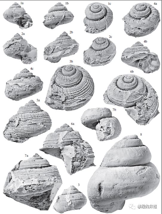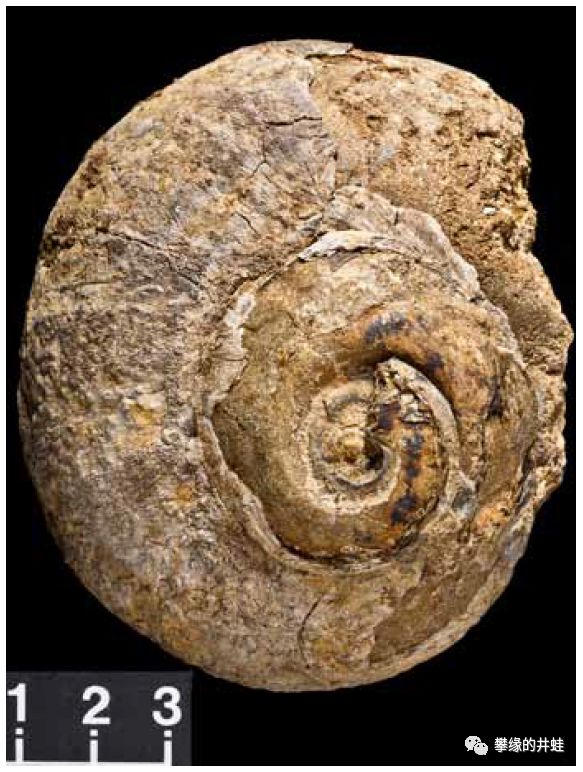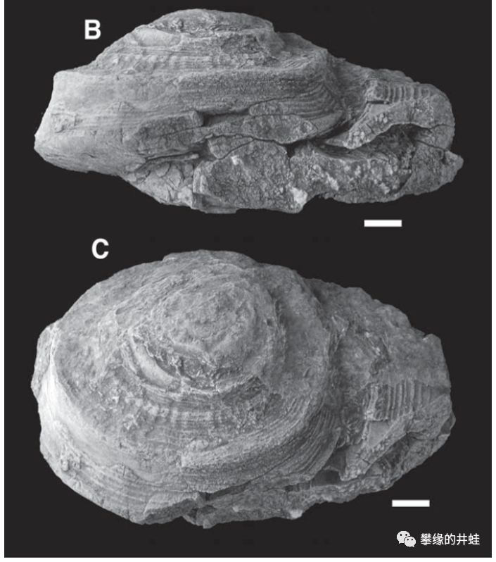 上图:晚二叠世大型腹足类Pleurotomaria。发现地:日本岩井崎石灰岩(IwaizakiLimestone),图片来源自[9],标尺长度1厘米。下图:中二叠世腹足类Keeneiaocula。发现地:澳大利亚悉尼盆地。图片来源自[2],标尺刻度为厘米。