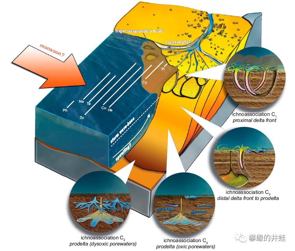 普拉莫洛盆地古地理环境复原图,这种河口三角洲加浅海的环境,很像美国的马荣溪化石群(参见第一百六十一回塔利怪物),连地质年代也很接近(都是大约3亿年前,石炭纪晚期到二叠纪早期)。图中标明了各种足迹化石的分布和生活环境。图片来源自[1]。