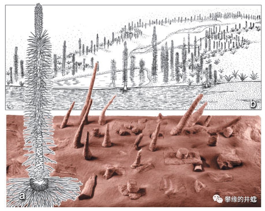 在炎热干旱的三叠纪,低矮的草本植物取代了森林。上图是一类三叠纪早期常见的大型草本石松:1.5到2米高的肋木属Pleuromeia。图片来源自[18]。