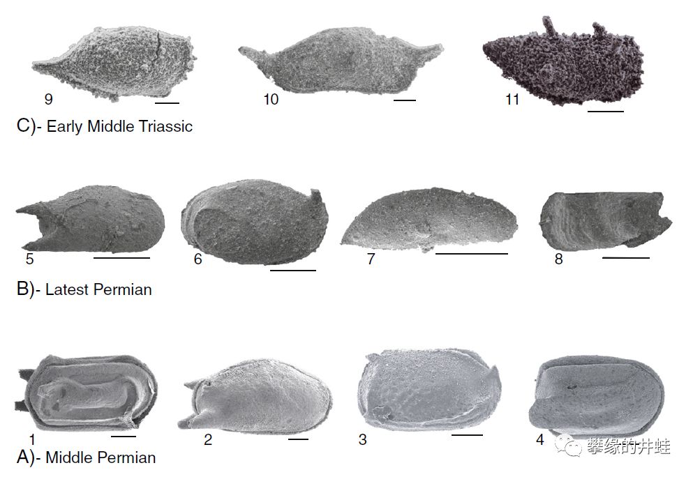 有一类微型甲壳动物——介形纲(Ostracoda )留下了非常丰富的化石资料,常被用做划分地层,研究古气候和古环境的重要依据。它们自然也在地层中深深记下了二叠纪末大灭绝的威力。