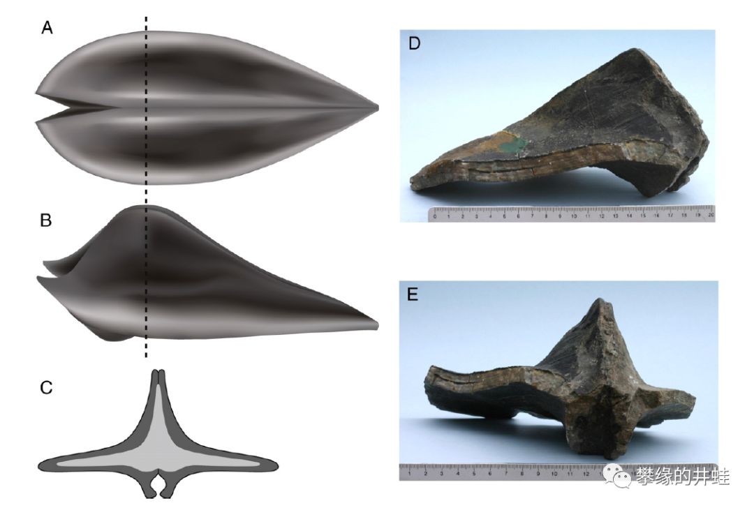 一些二叠纪翅蛤科(Alatoconchidae)的贝壳可以长到1米长,是古生代最大的双壳类。上图是日本发现的巨型翅蛤Shikamaia ogulineci贝壳碎片化石(D,E)和翅蛤科完整贝壳复原图(A-C)。它们的贝壳在水平方向延伸成非常夸张的形状,应该是像今天的砗磲一样,固定在海底不动。图片来源自[6]。