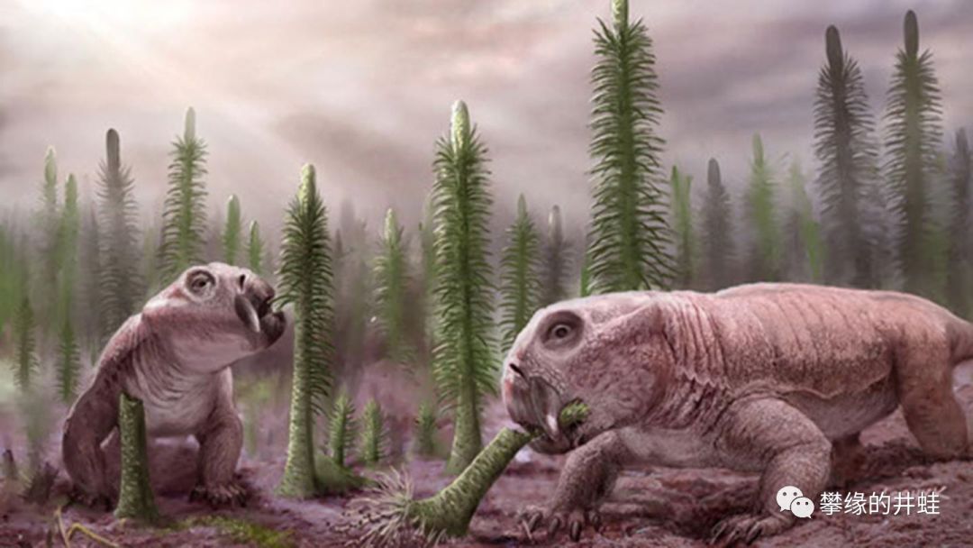 壳椎类灭绝(参见第二百三十回螈怪)。残存的离片椎类依然占据着淡水食物链的高层,但它们的时代即将结束,因为蜥形纲即将把河湖水系也纳入治下。滑体两栖类在二叠纪末出现并奇迹般地幸存下来(参见第二百二十九回蟾祖),成为龙兽两族之外的四足动物仅存的血脉。
