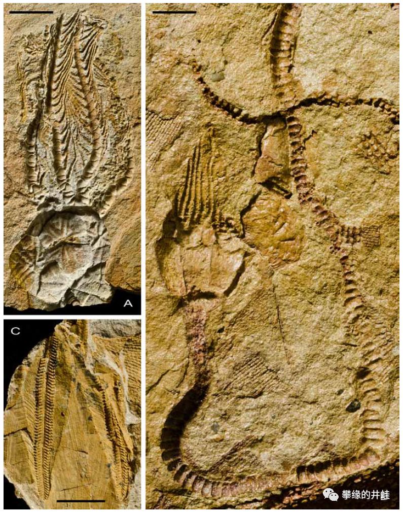 澳大利亚悉尼盆地(Sydney Basin)出土的中二叠世棘皮动物化石。A,B为海百合,C为海蕾(部分腕)。也许是曾经的竞争者们让出了生存空间的缘故,幸存下来的少数海百合在三叠纪出现了一轮爆发式的多样化,也算是祸福相倚吧。图片来源自[2],标尺长度1厘米。